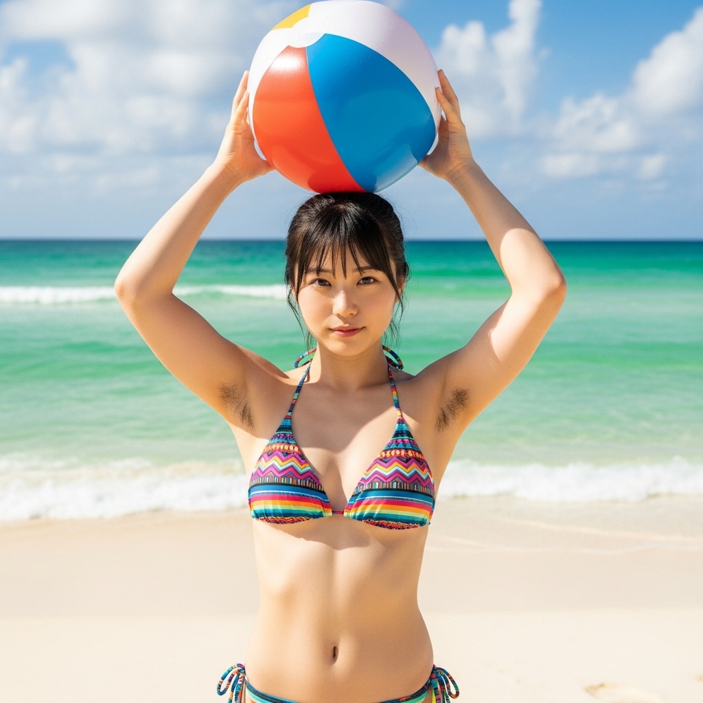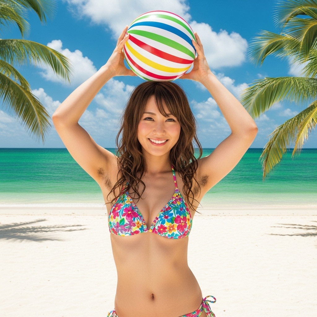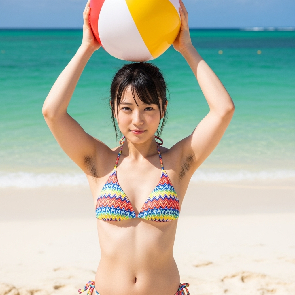 photo of japanese woman like idol, a tropical beach with white sand and emerald green ocean behind her. She is wearing a colorful bikini top that fits her petite figure, holding a beachball overhead, armpit hair, photorealistic style, 8k quality