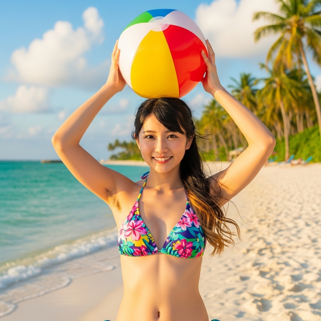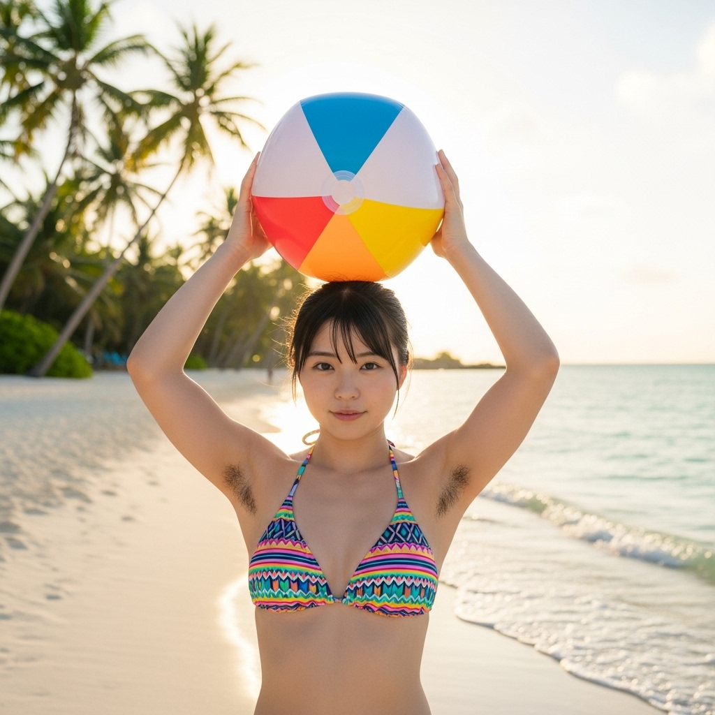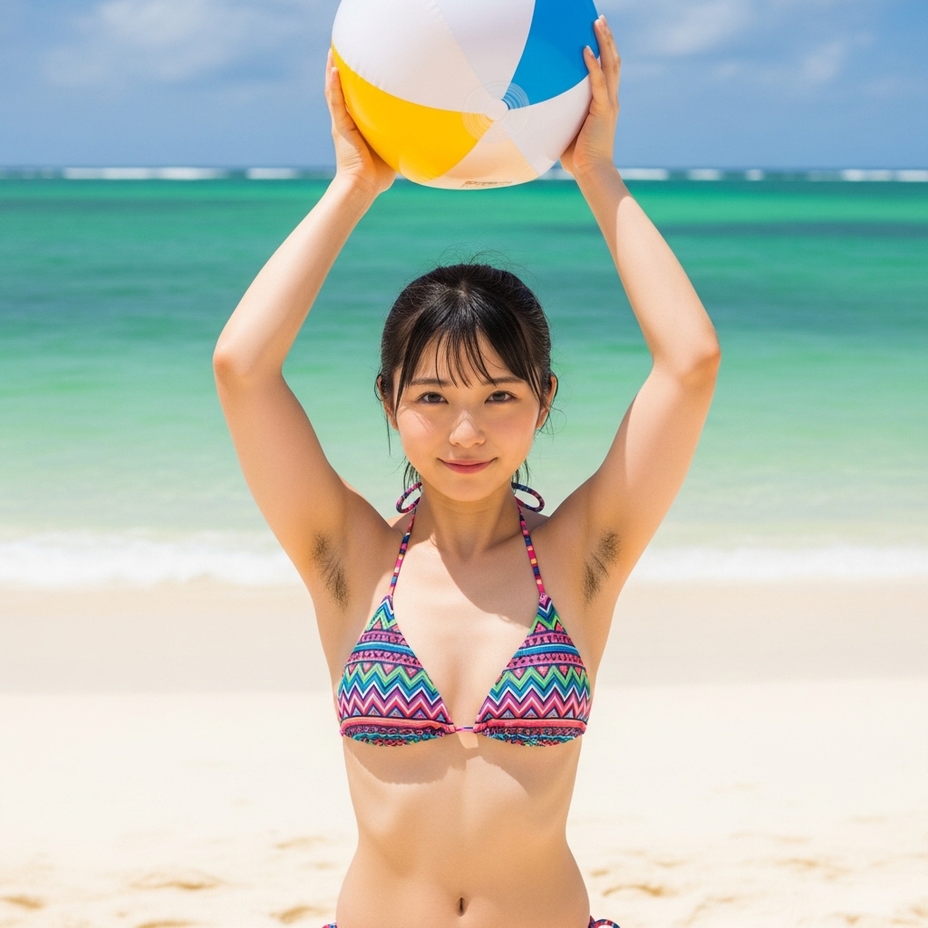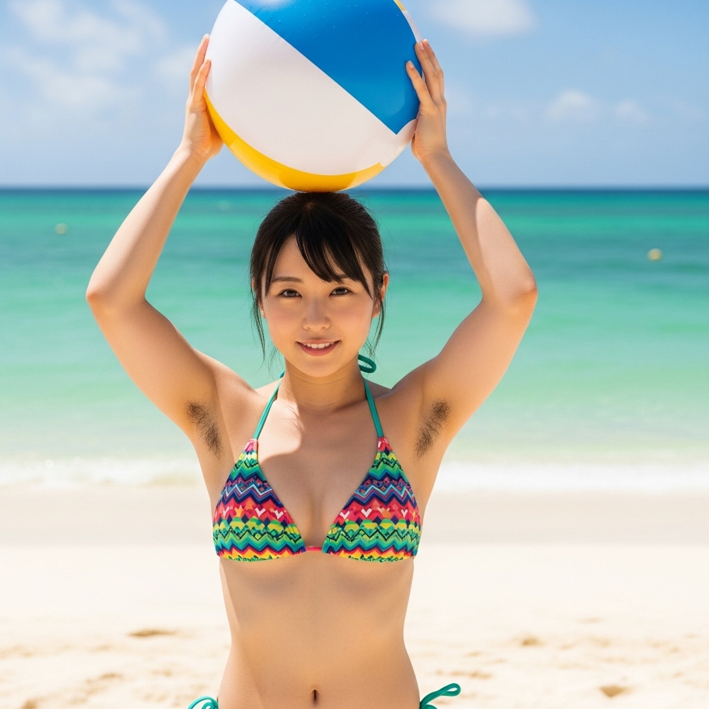photo of japanese woman like idol, a tropical beach with white sand and emerald green ocean behind her. She is wearing a colorful bikini top that fits her petite figure, holding a beachball overhead, armpit hair, photorealistic style, 8k quality