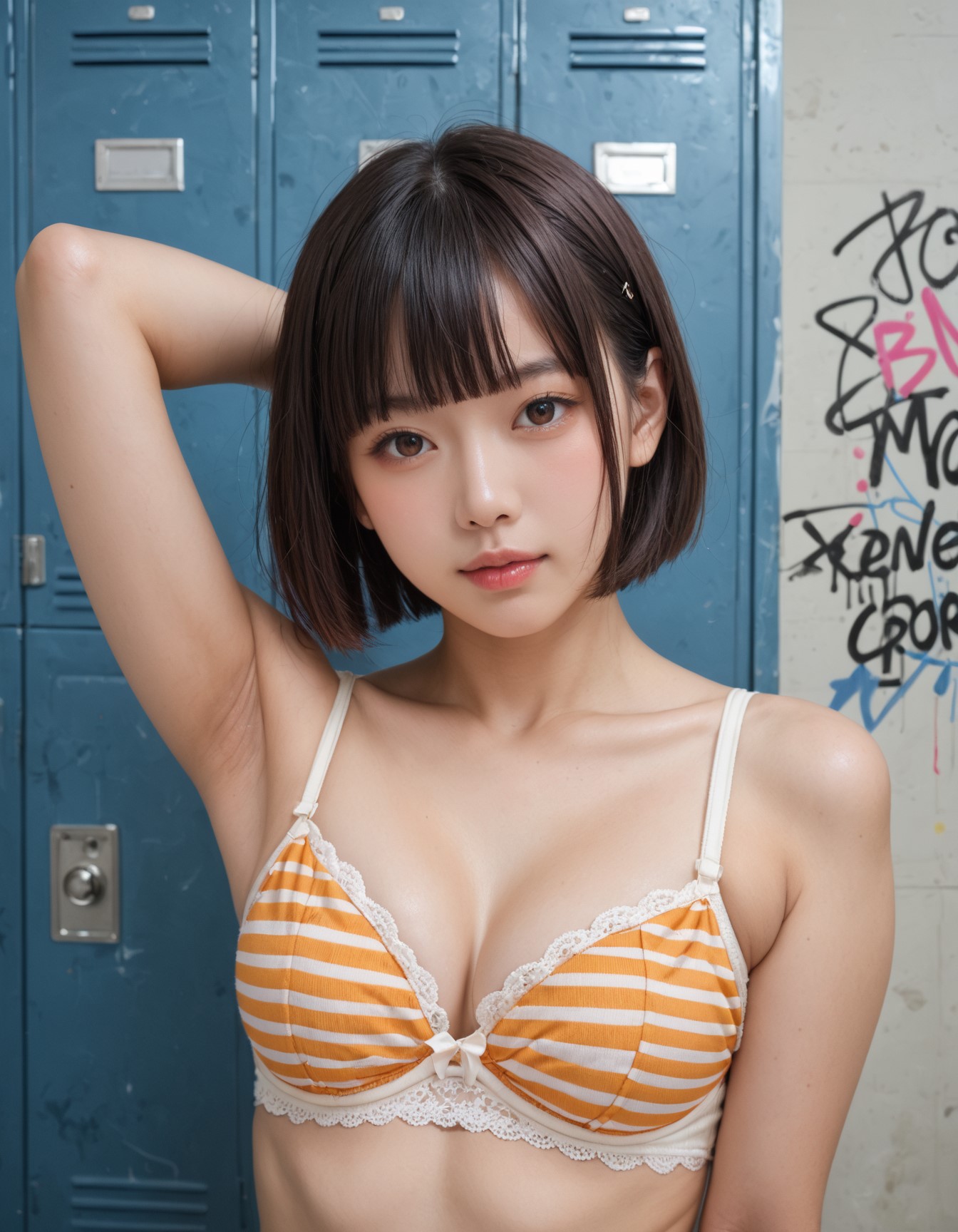 score_9, score_8_up, score_7_up, ultra realistic, high resolution, beautiful woman like kpop idol, tareme, short hair, blunt bangs, arm behind head, dark armpit, orange striped bra, upper body, BREAK in locker room, Graffiti on the wall, Nostalgic and melancholic atmosphere