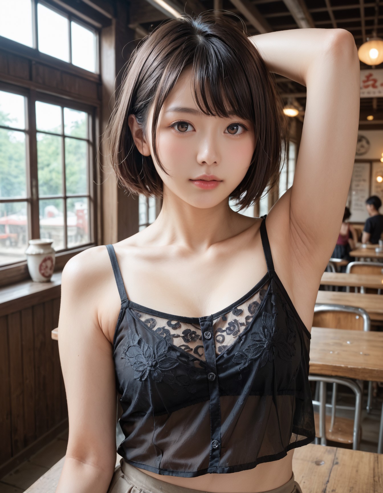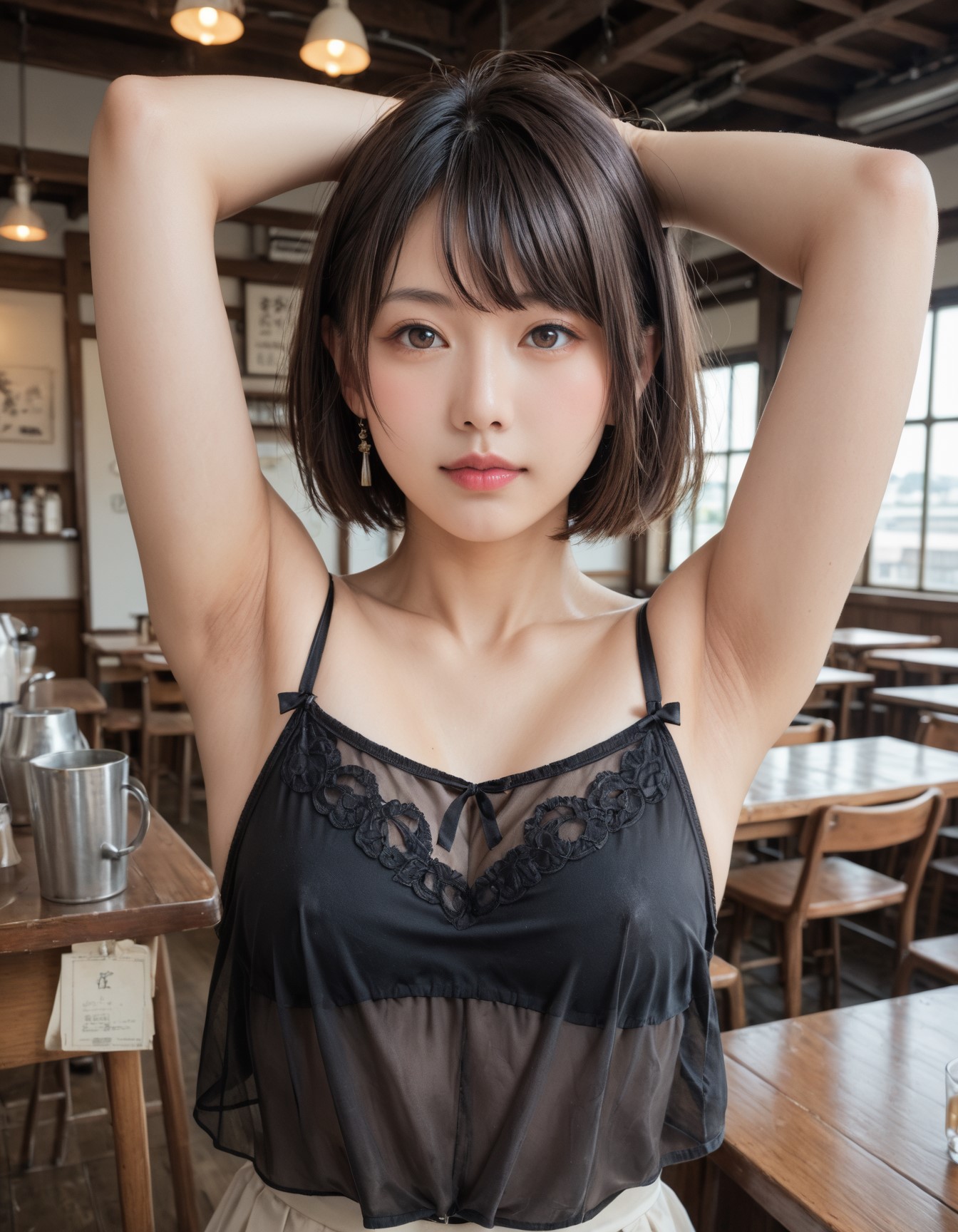 score_9, score_8_up, score_7_up, ultra realistic, high resolution, japanese woman, tareme, short hair, swept bangs, detailed armpit, black see-through camisole, upper body, in abandoned cafe