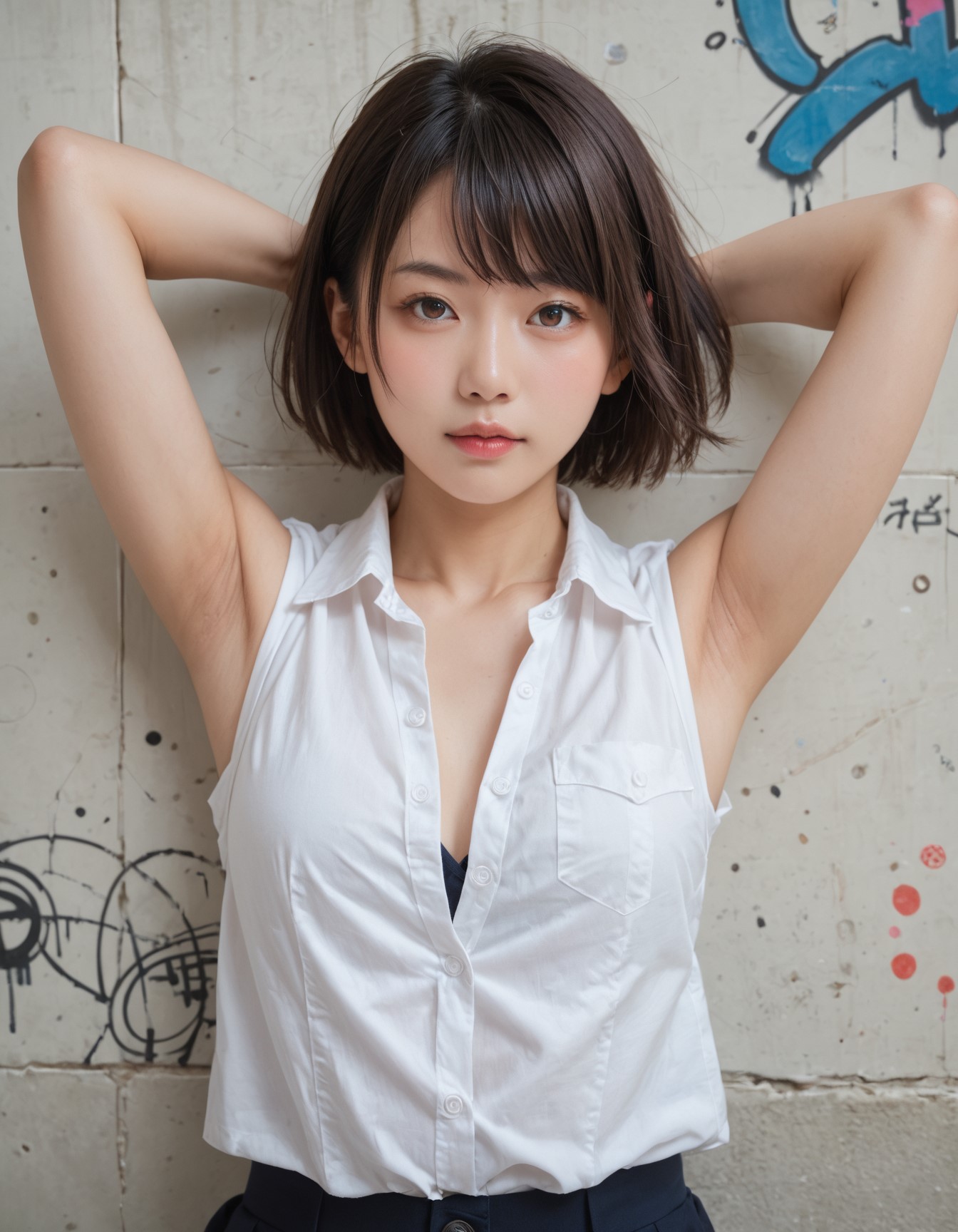 score_9, score_8_up, score_7_up, ultra realistic, high resolution, japanese woman, tareme, short hair, swept bangs, arm behind head, dark armpit, sleeveless white buttoned shirt, upper body, front view, Graffiti on the wall