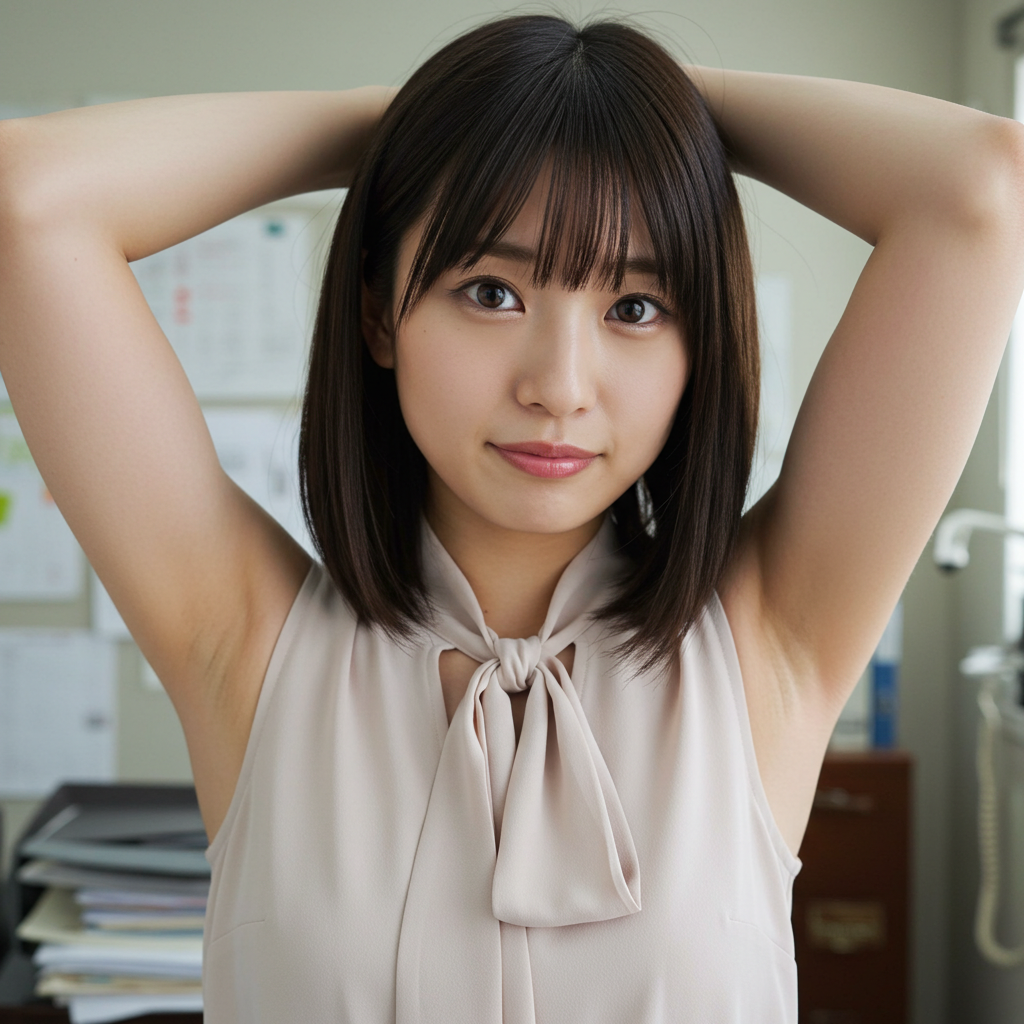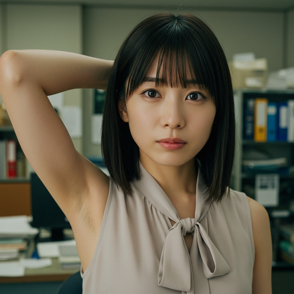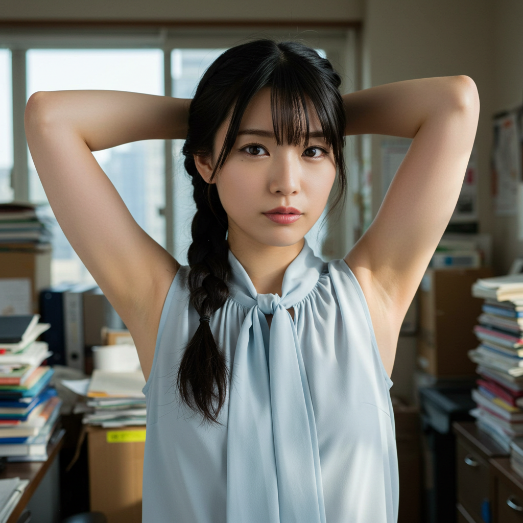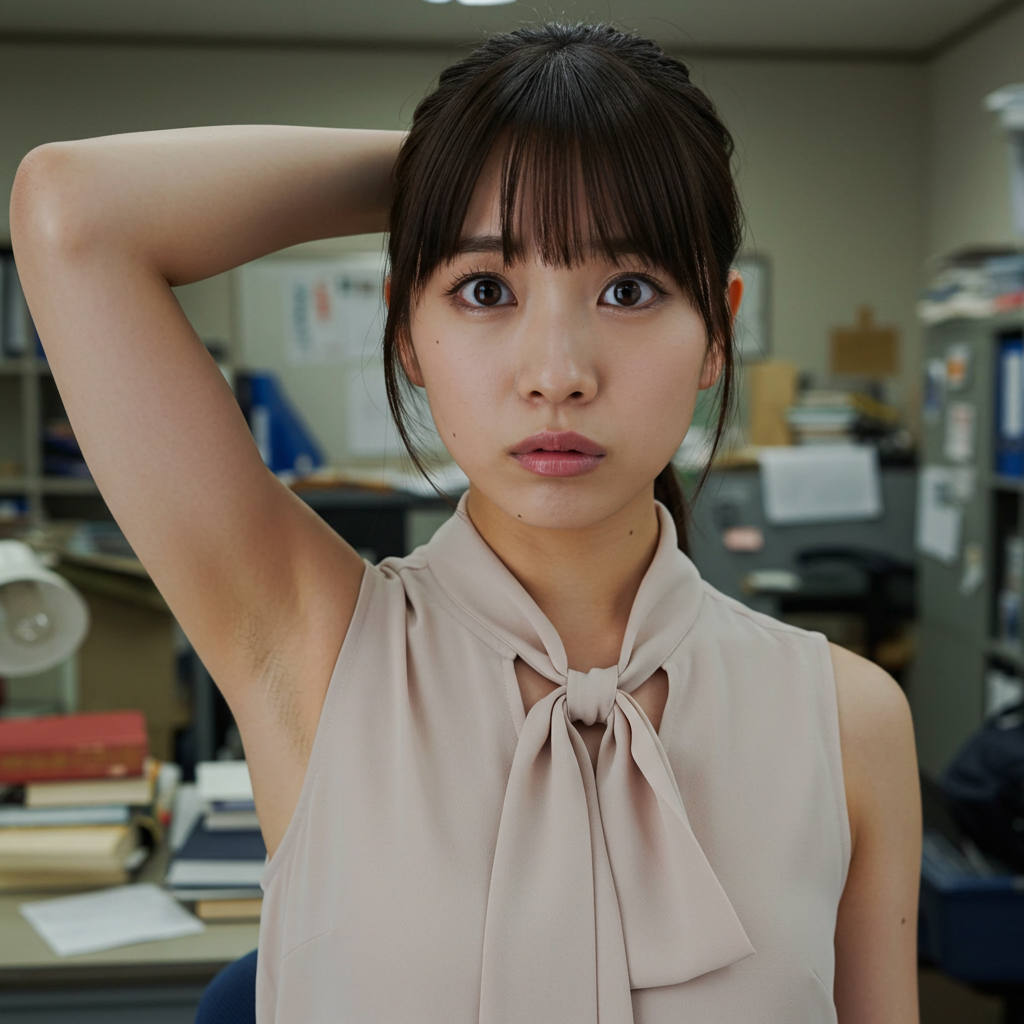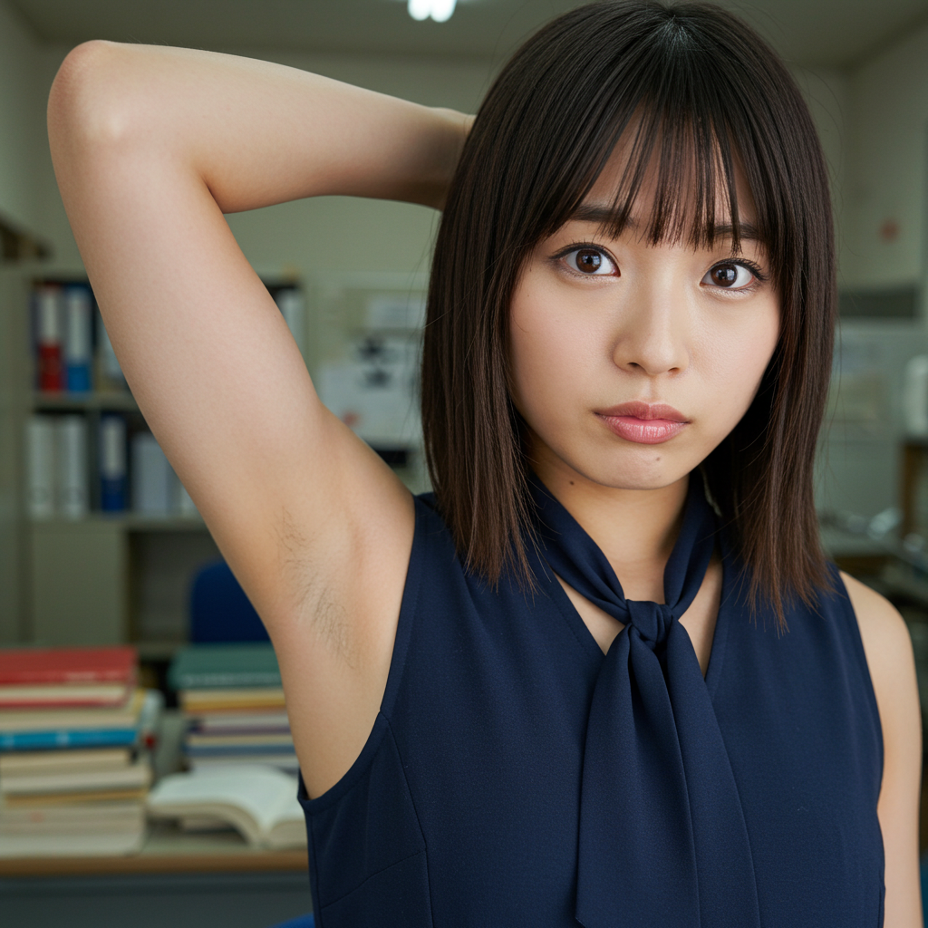 close up photo of japanese female teacher, blunt bangs, sleeveless tie neck blouse, show off hairy armpit, in messy office room, photorealistic style, 8k quality