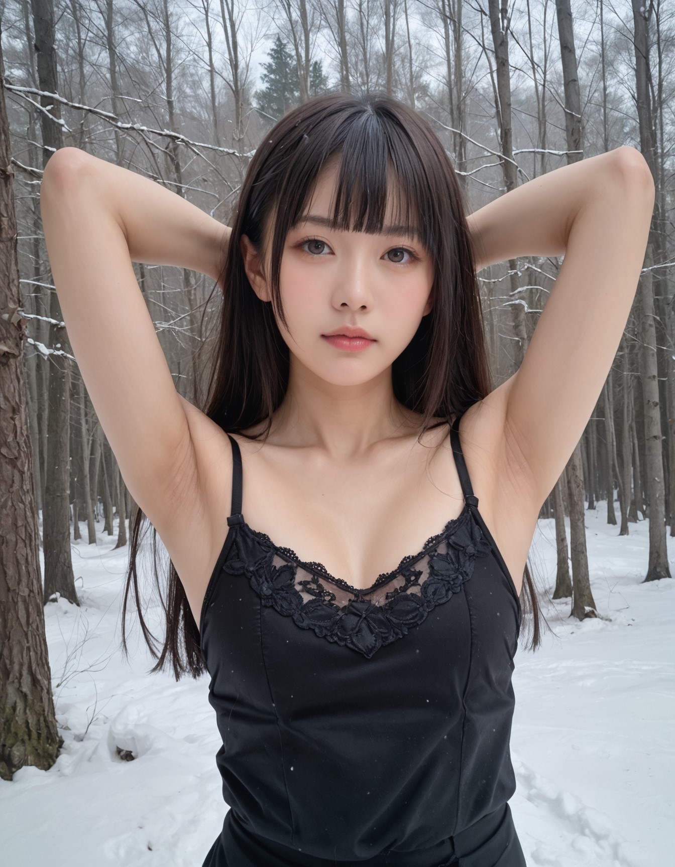 score_9, score_8_up, score_7_up, realistic photo of japanese female idol, hime cut, front view, arm behind head, dark armpit, satin camisole, upper body, winter, forest