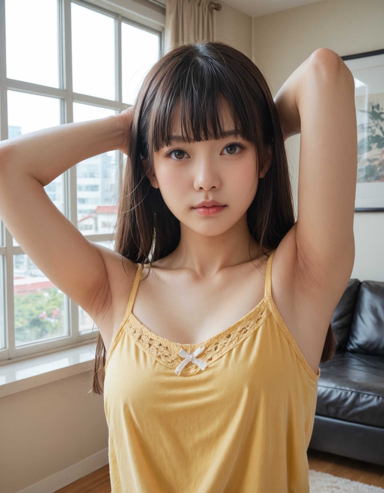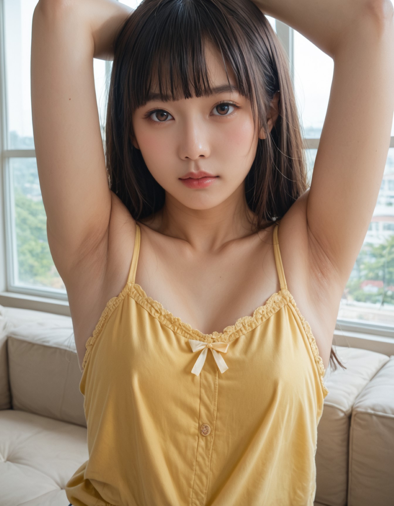 score_9, score_8_up, score_7_up, realistic photo of japanese female announcer, hime cut, front view, arm behind head, dark armpit, yellow camisole, upper body, living room, large window, Nostalgic and melancholic atmosphere