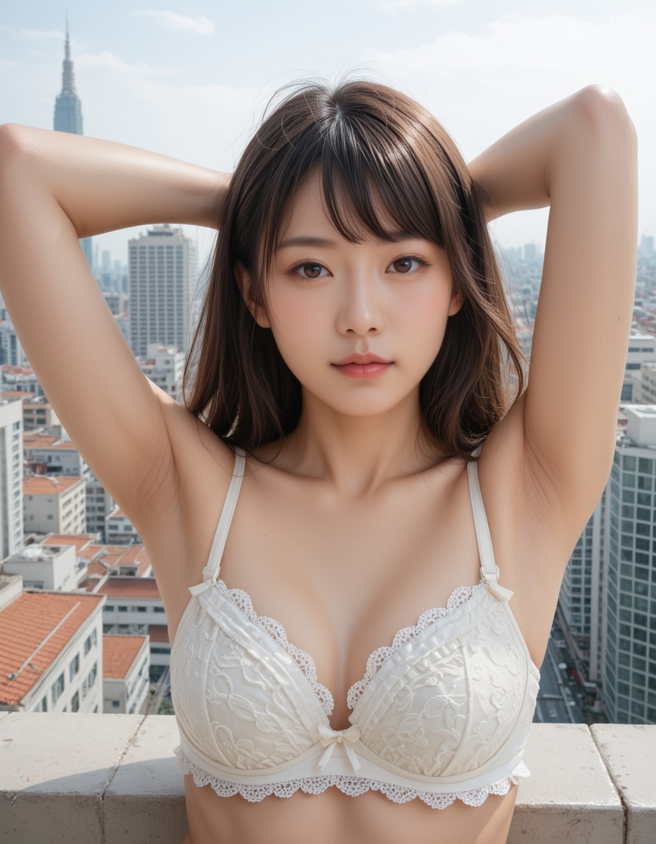 score_9, score_8_up, score_7_up, ultra realistic, high resolution, stunning oriental woman, swept bangs, arm behind head, detailed armpit, ruffled bra, upper body, front view, city, rooftop, Nostalgic and melancholic atmosphere