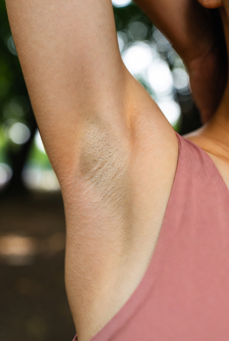 extreme close-up of a young adult japanese woman’s slightly glistening armpit after light exercise, natural shaved skin with visible pores and subtle peach fuzz, delicate skin folds and soft shadows, arm gracefully raised, wearing sleeveless pink top, outdoor sunny park, beautiful bokeh, Photorealistic Masterpiece, 8K, raw natural skin texture, no retouching, visible fine details, Nikon Z9, 105mm macro lens, f/2.0, soft natural side lighting