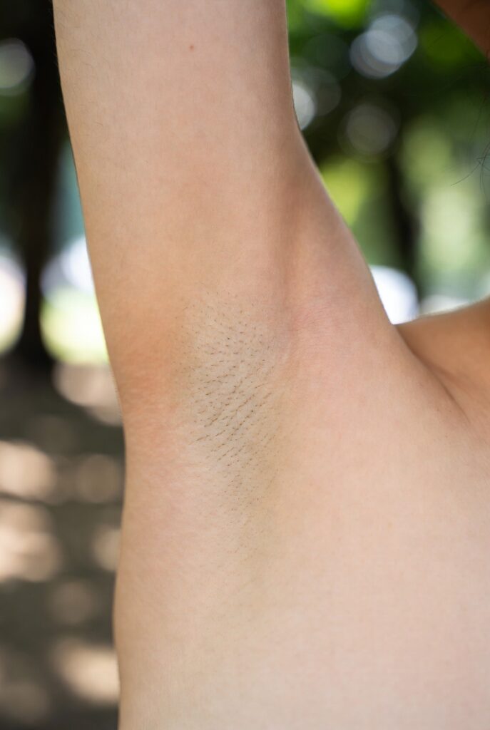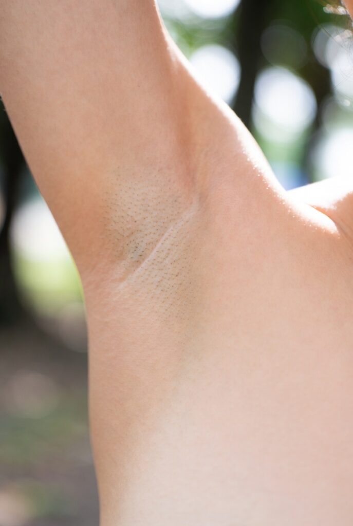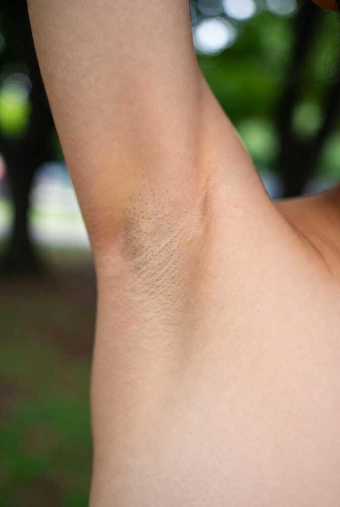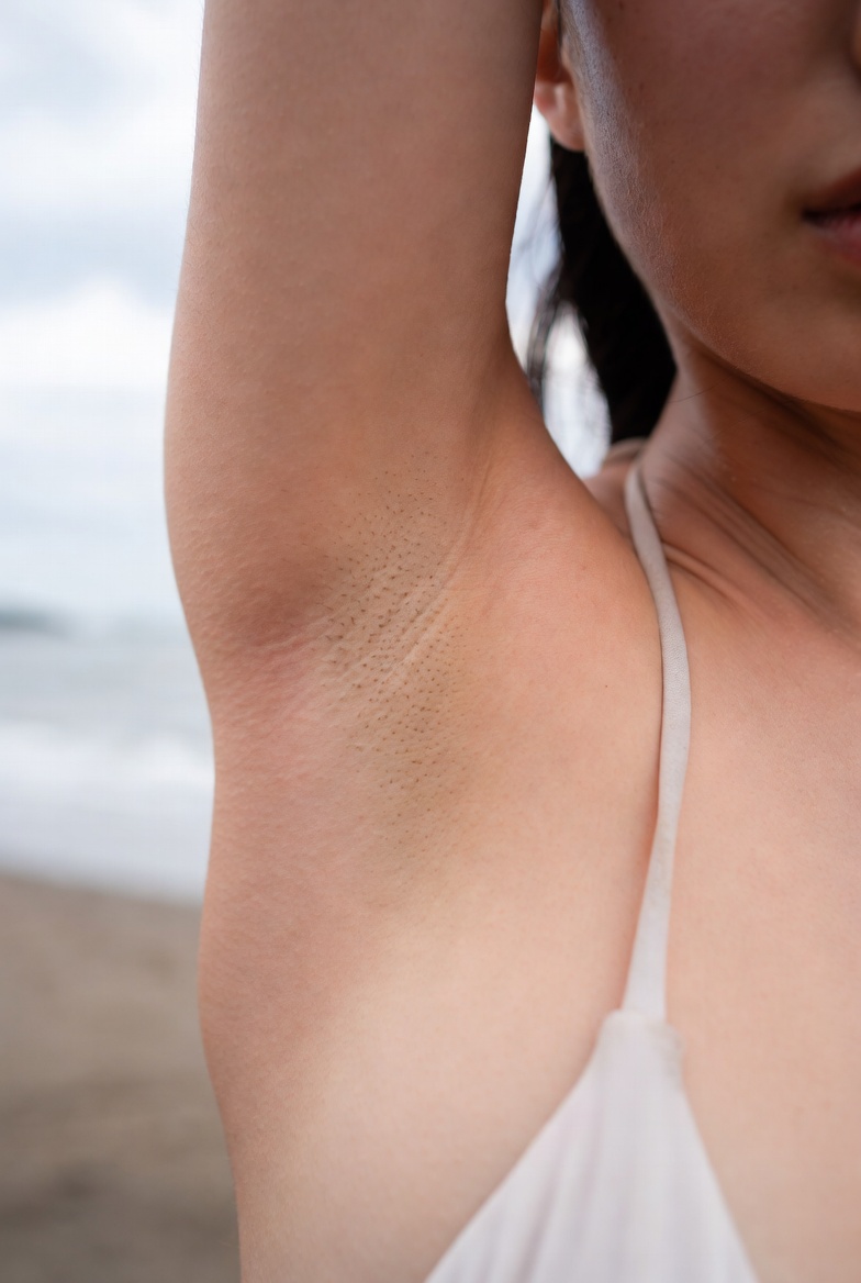 close-up of a young Japanese woman’s smooth shaved armpit, arm raised naturally, delicate skin with visible pores and fine peach fuzz, soft natural skin tone, outdoor park setting with bokeh background, Extreme Close-up, Photorealistic Masterpiece, 8K resolution, Detailed skin texture with visible pores and natural imperfections, no beauty filters or retouching, raw unfiltered photography, focus on armpit, Nikon Z9, Nikkor Z MC 105mm f/2.8 VR S lens, f/1.8 aperture, soft diffused natural light from the side