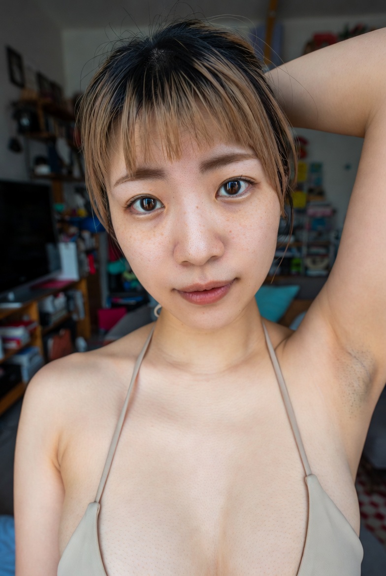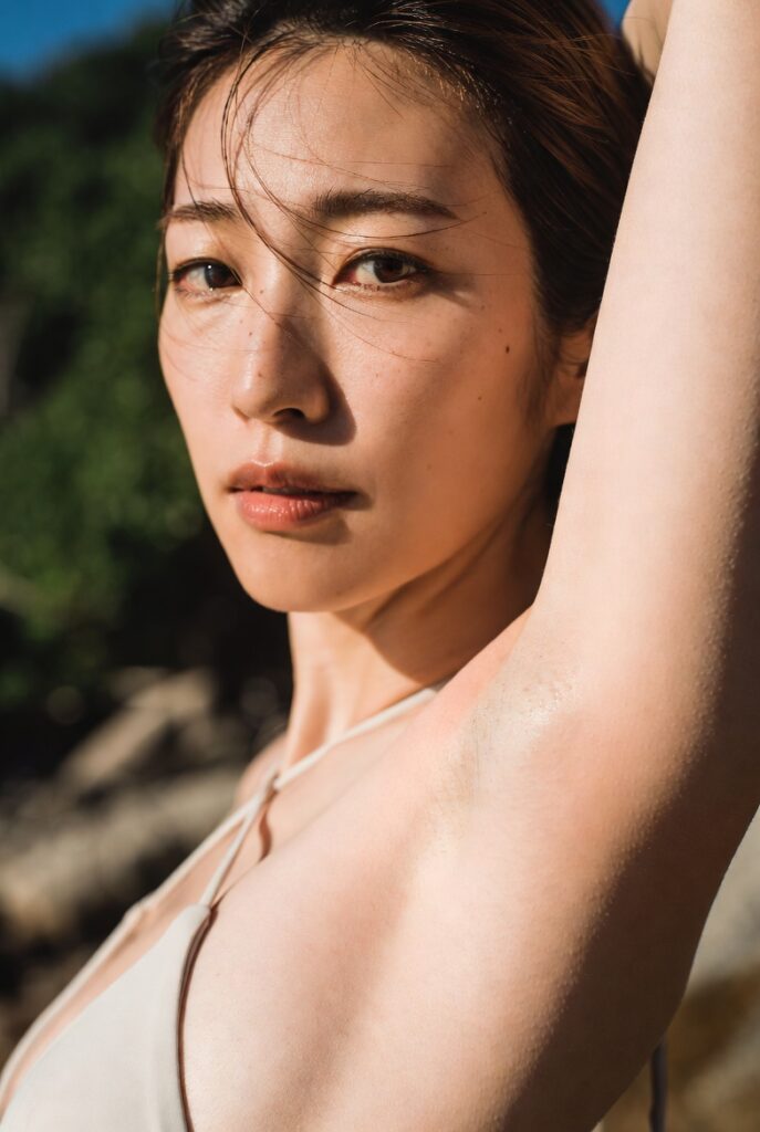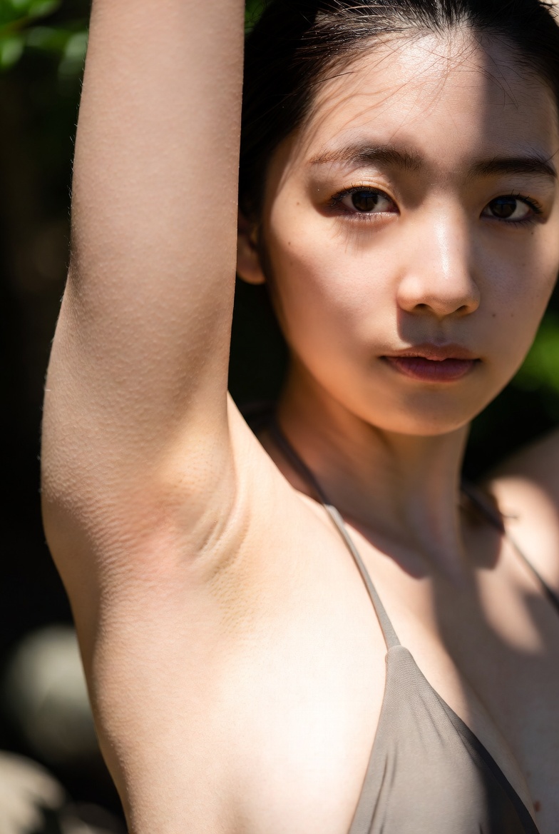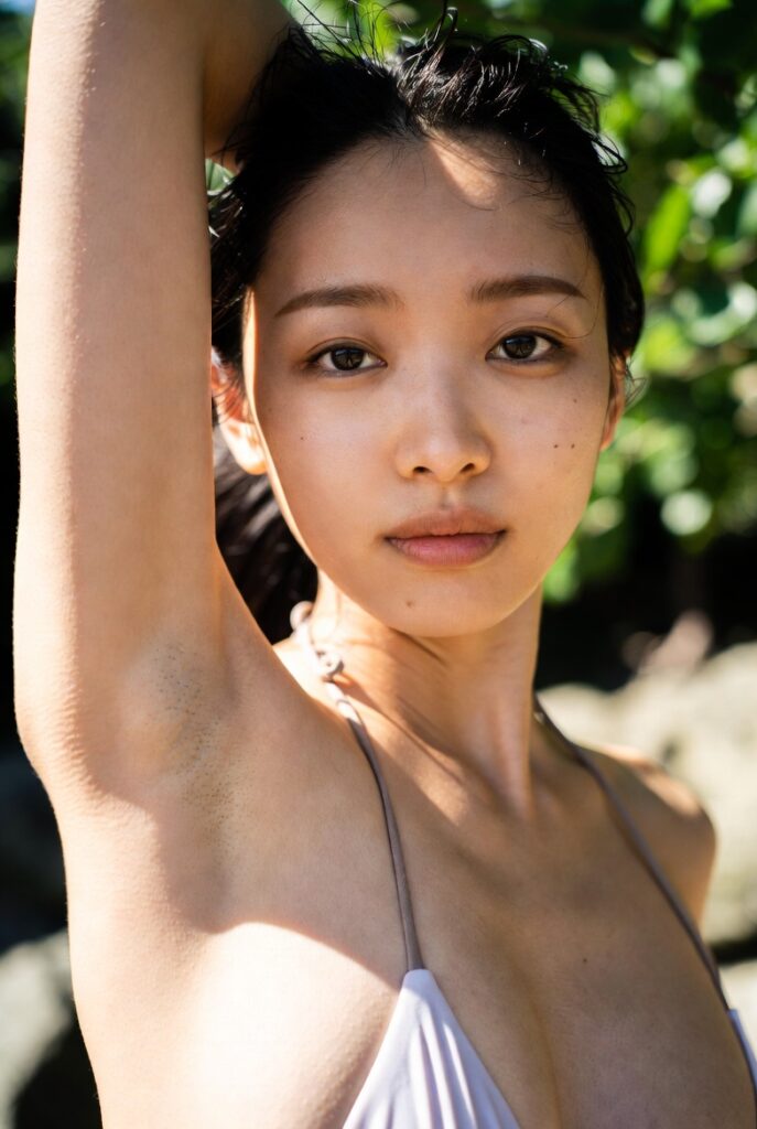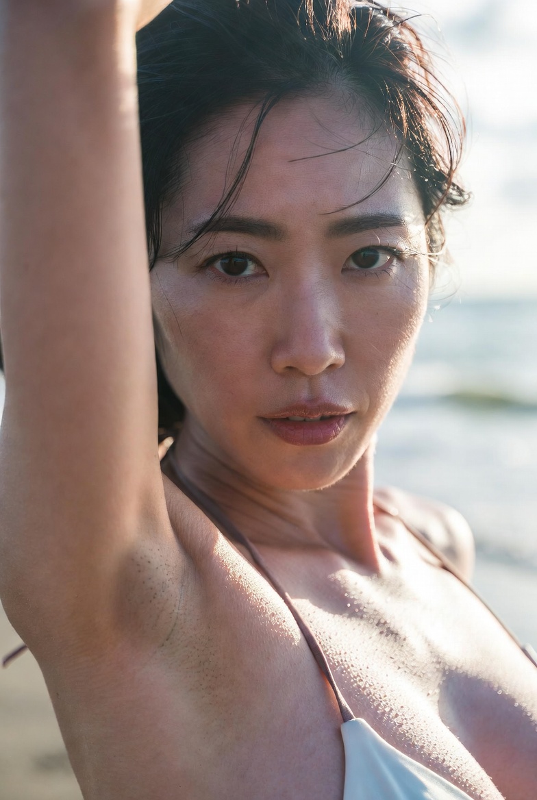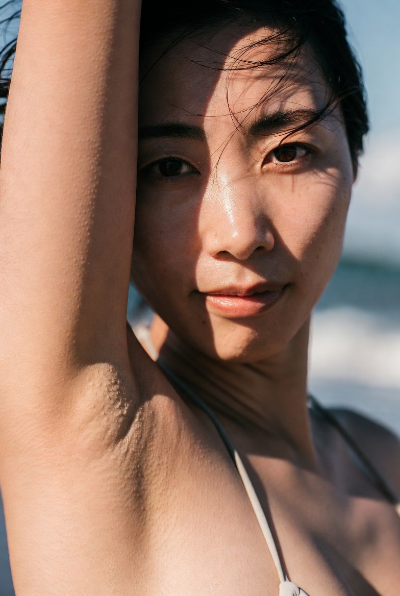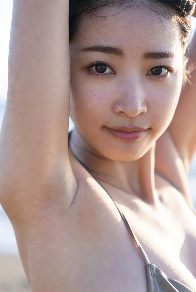 photo of a Japanese woman in her early 20s, bikini, smooth shaved armpit, arm raised naturally, delicate skin with visible pores and fine peach fuzz, beach, Cinematic natural lighting. no beauty filters or retouching, raw unfiltered photography