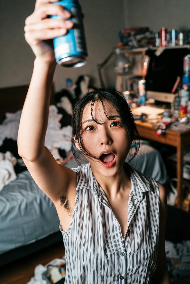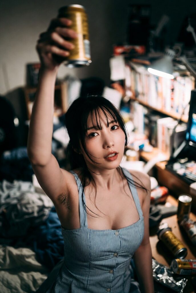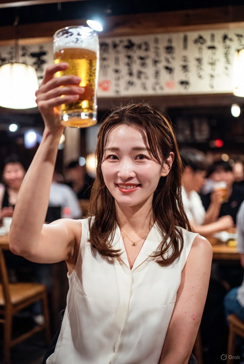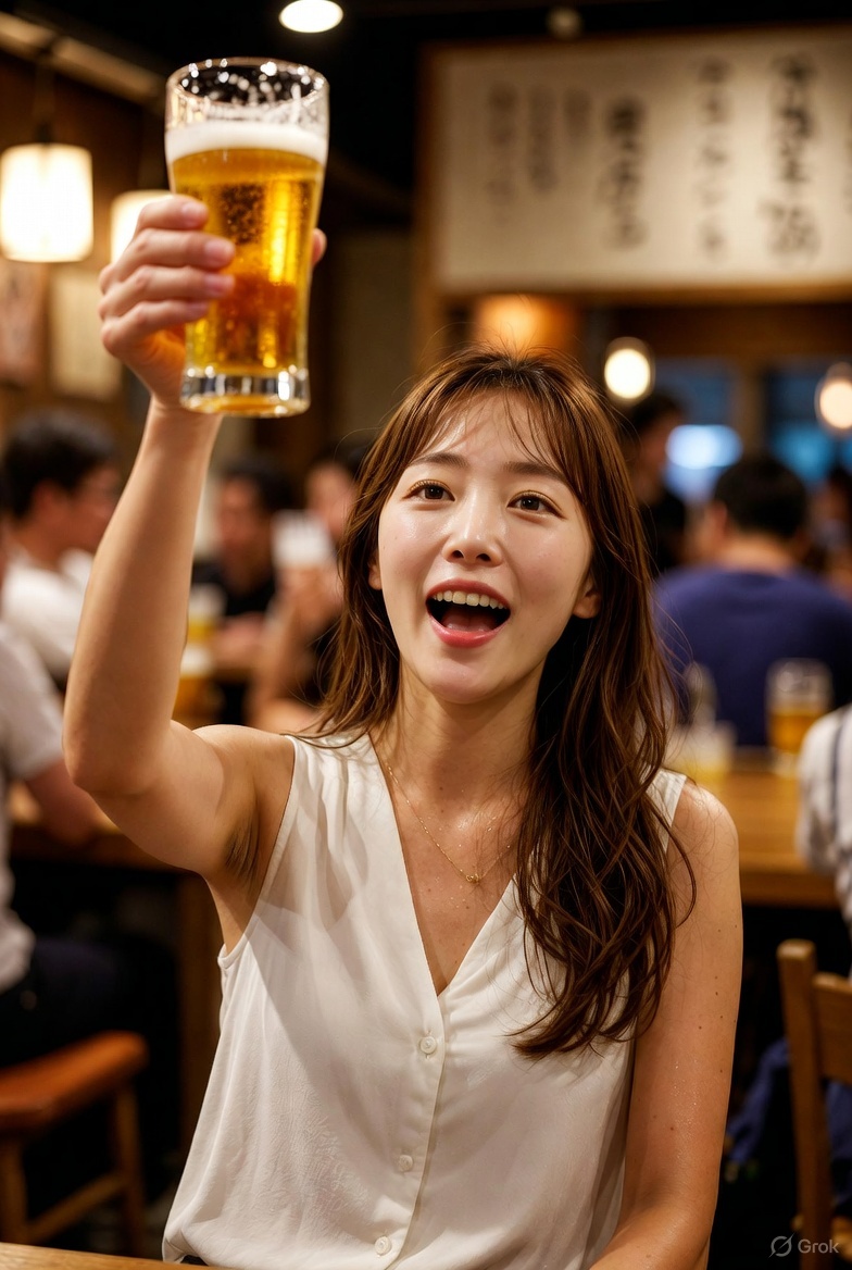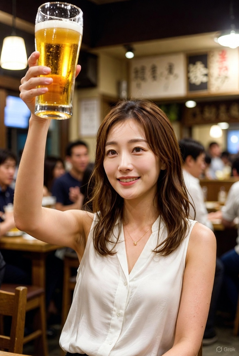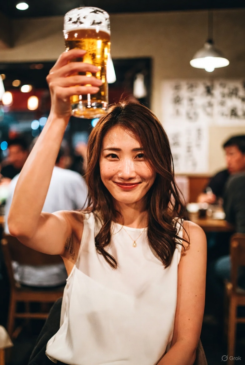 She is inside a lively, casual Japanese izakaya, raising a large glass of draft beer high above her head as if saying “Kanpai!”, revealing natural underarm hair.