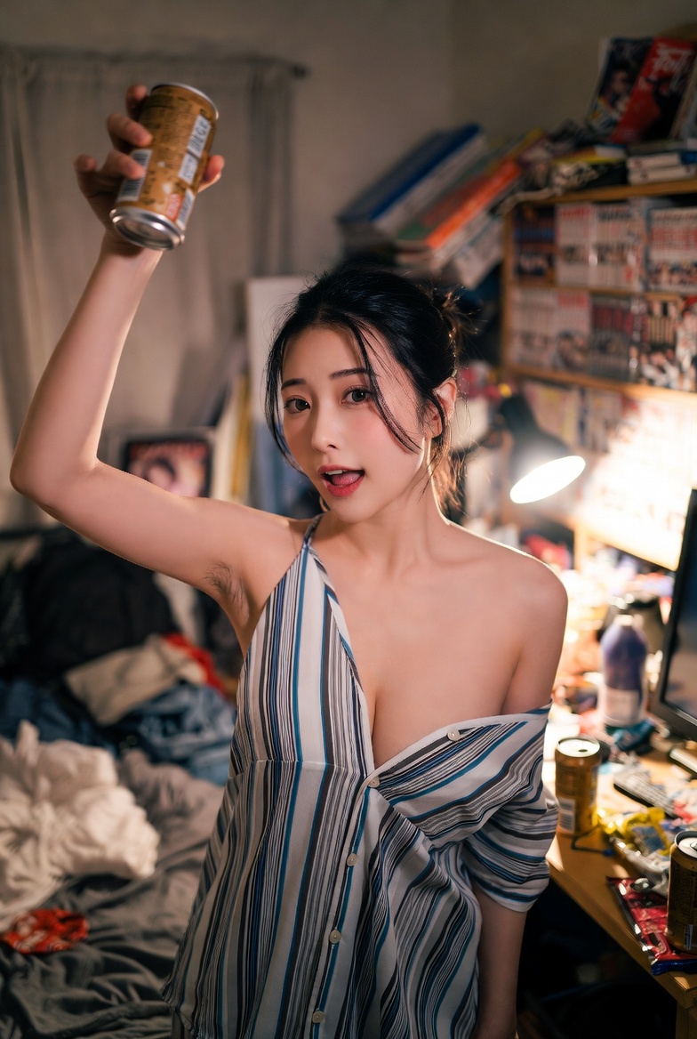 realistic, photorealistic, japanese woman, medium hair, blunt bangs, arm up, delicate skin with visible pores and fine peach fuzz, sheer mesh bikini top, upper body, Mysterious atmosphere, In a messy living room, Detailed skin texture with visible pores, raw unfiltered photography