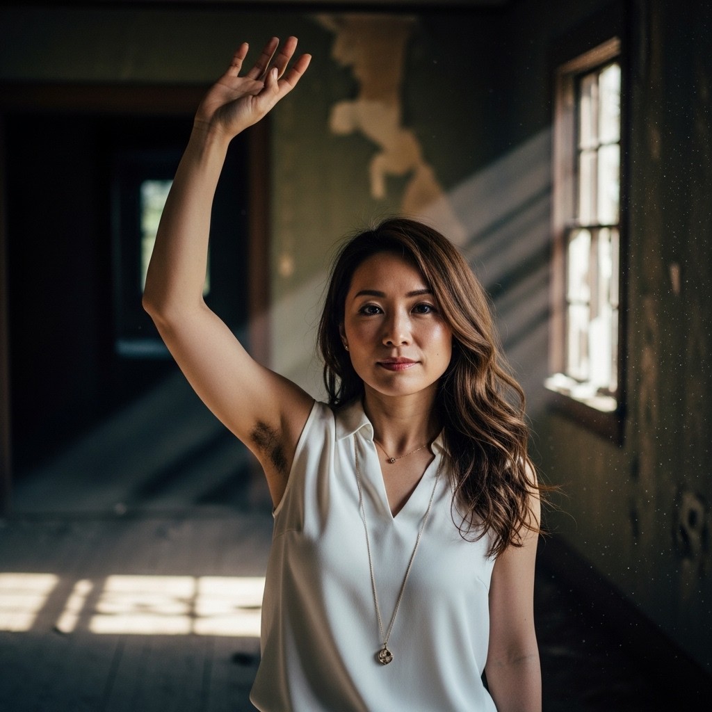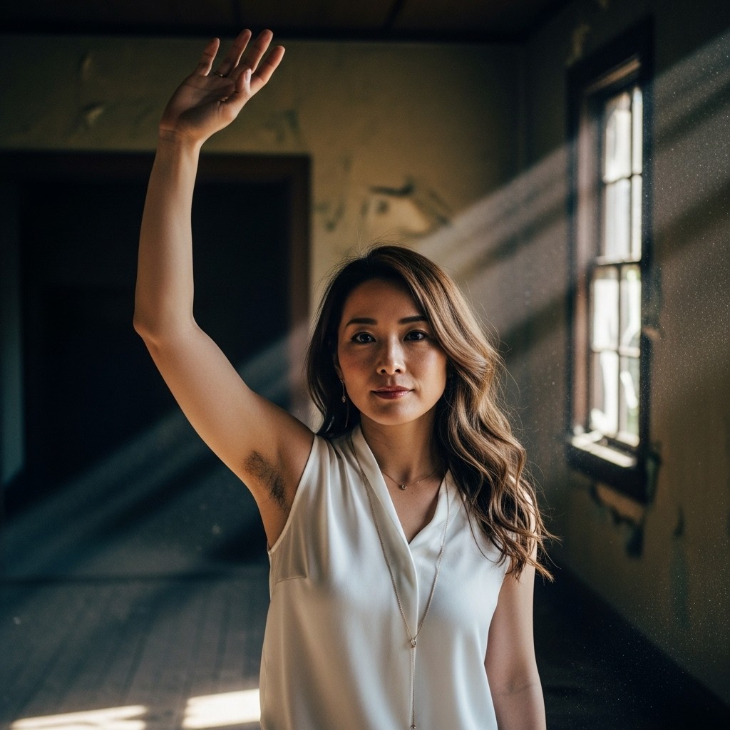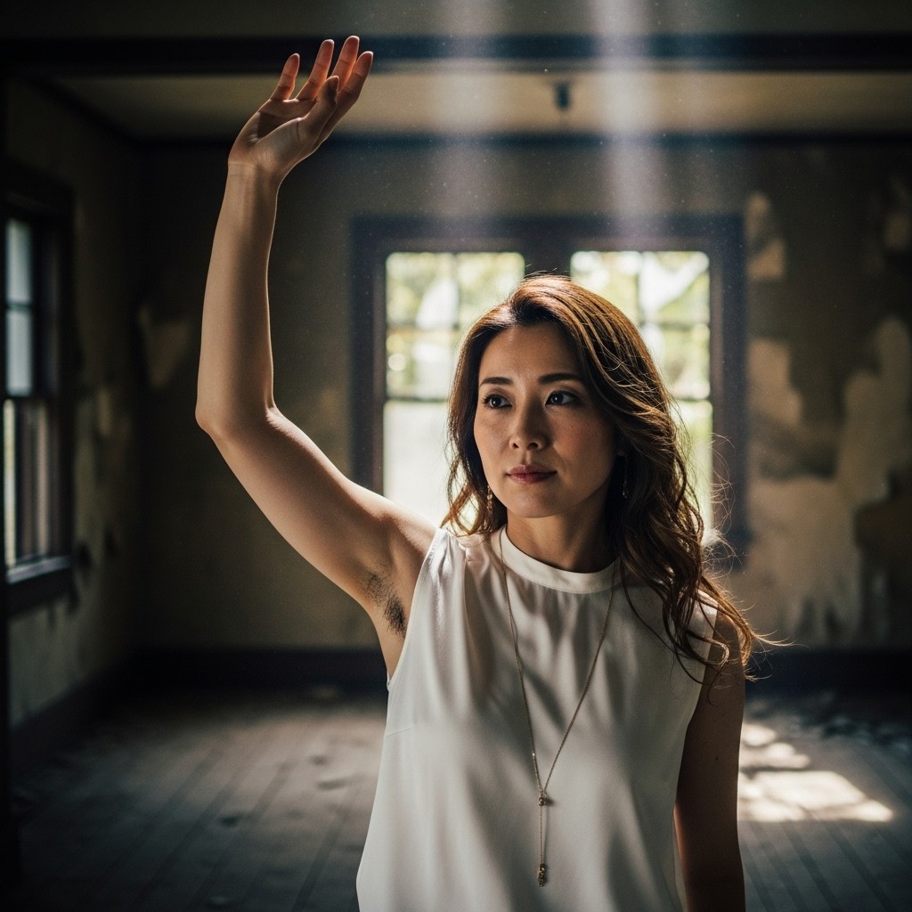 A photorealistic portrait of a Japanese woman in her 30s, long wavy brown hair, wearing a sleeveless white silk blouse and a delicate gold necklace. She raises her right arm high and gently waves her hand, revealing natural underarm hair.Inside a dimly lit abandoned house, cracked walls, peeling paint, broken windows, dust floating in the air.Soft moody lighting coming through a narrow window, faint cold daylight mixed with subtle shadow, cinematic low-key lighting.Quiet, slightly melancholic atmosphere.Shallow depth of field, detailed skin texture, pore-level detail, shot on 35mm film, realistic film grain.