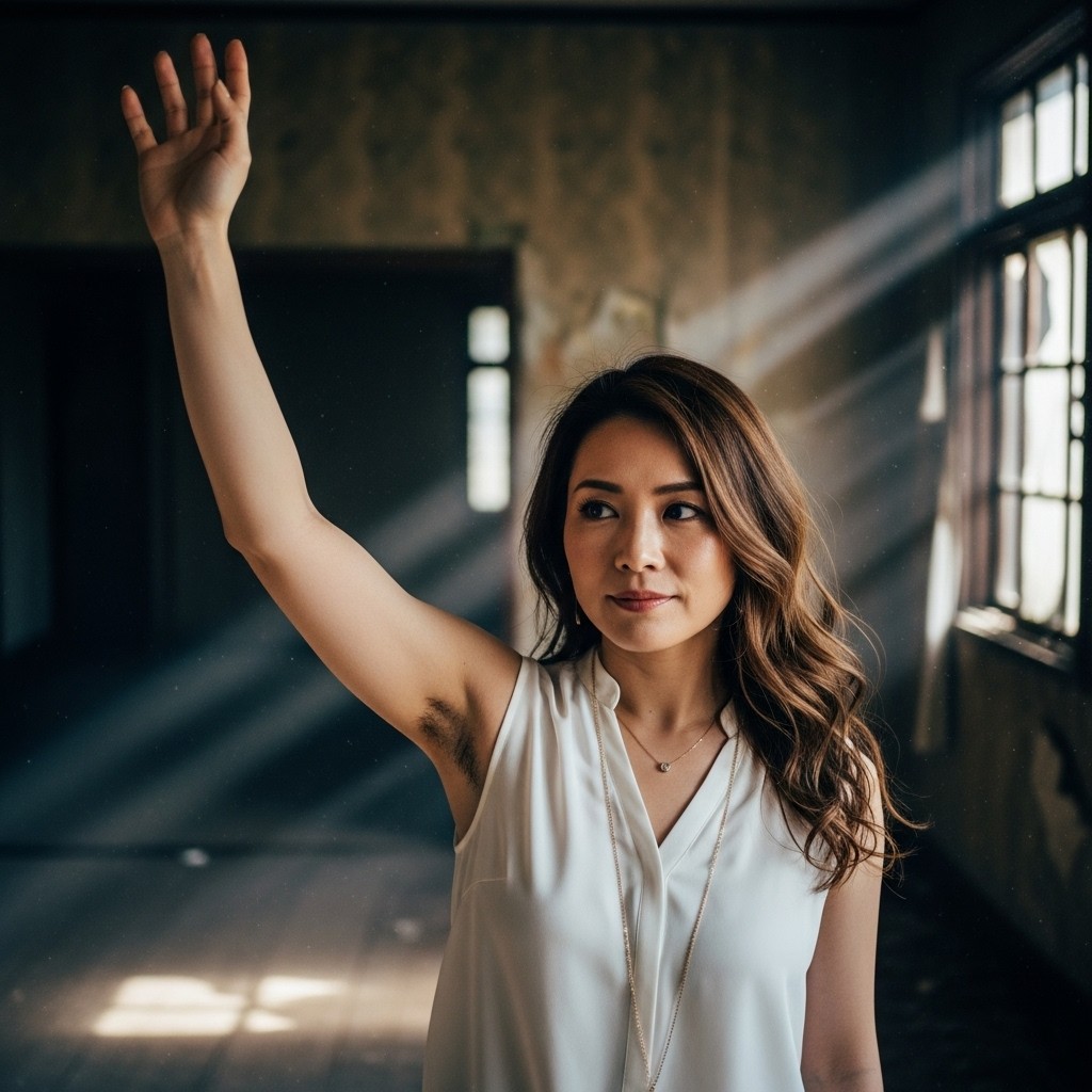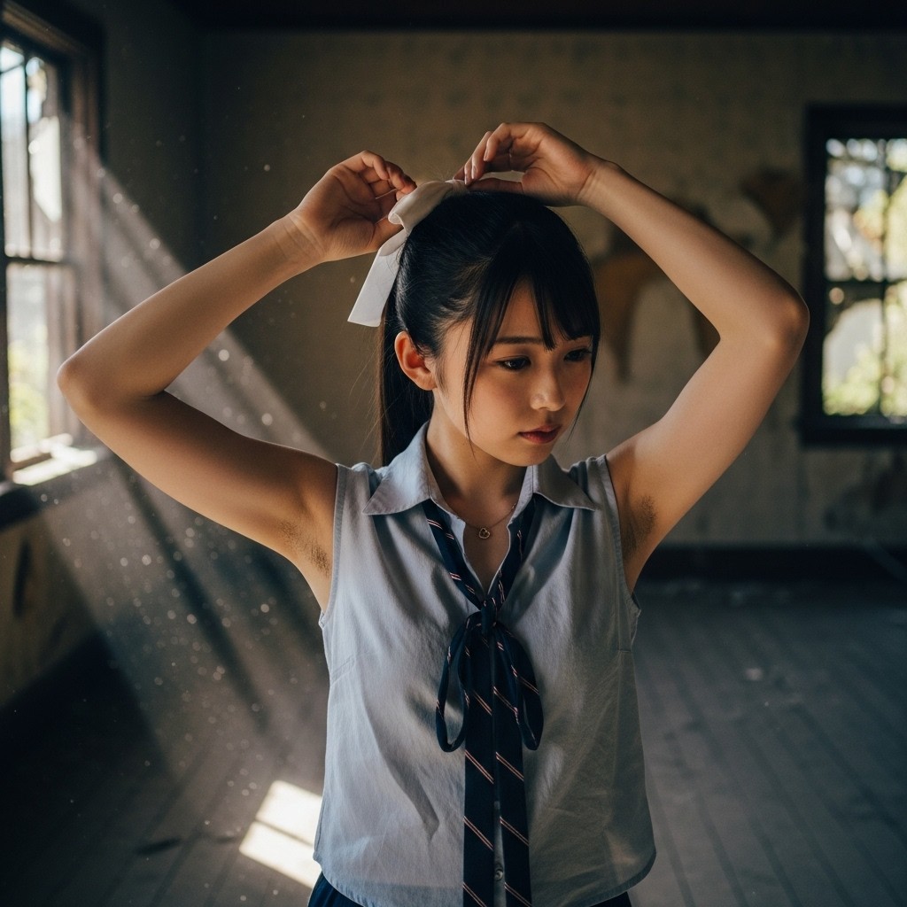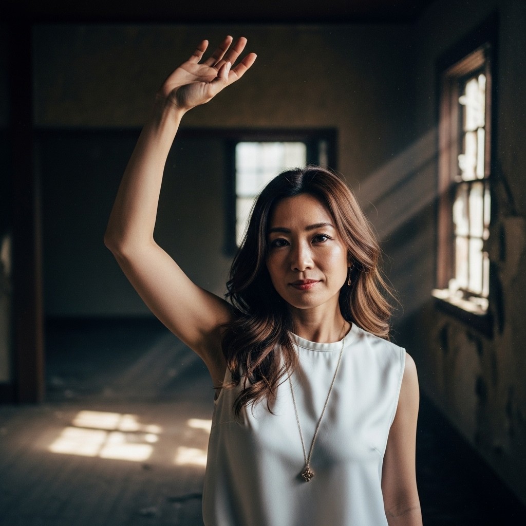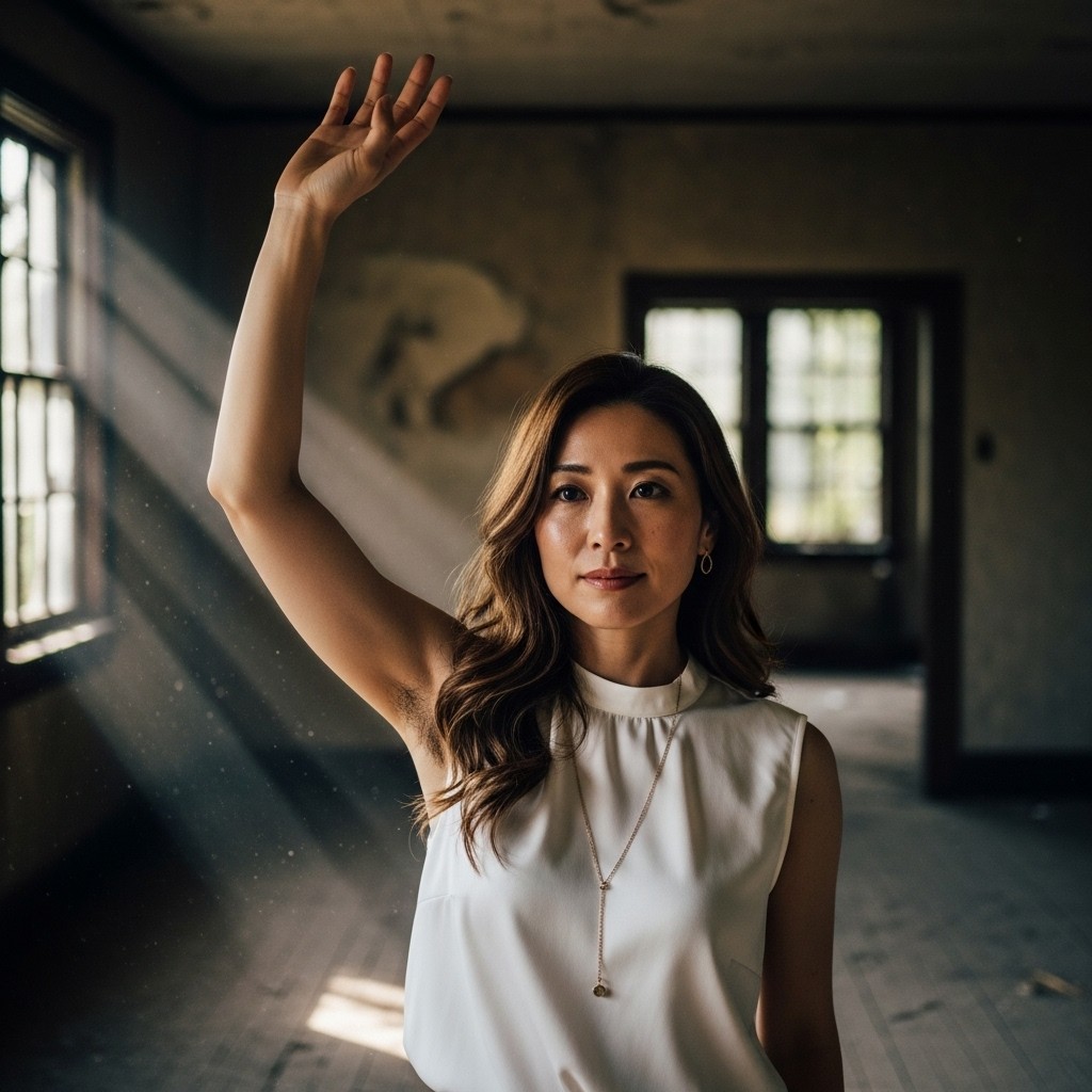 A photorealistic portrait of a Japanese woman in her 30s, long wavy brown hair, wearing a sleeveless white silk blouse and a delicate gold necklace. She raises her right arm high and gently waves her hand, revealing natural underarm hair.Inside a dimly lit abandoned house, cracked walls, peeling paint, broken windows, dust floating in the air.Soft moody lighting coming through a narrow window, faint cold daylight mixed with subtle shadow, cinematic low-key lighting.Quiet, slightly melancholic atmosphere.Shallow depth of field, detailed skin texture, pore-level detail, shot on 35mm film, realistic film grain.