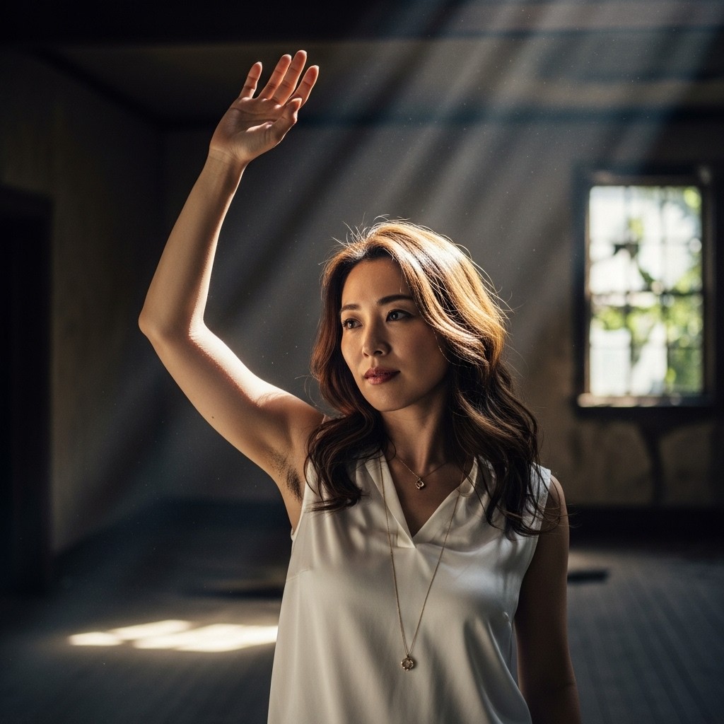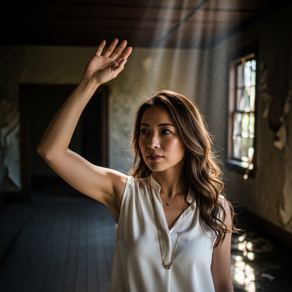 A photorealistic portrait of a Japanese woman in her 30s, long wavy brown hair, wearing a sleeveless white silk blouse and delicate gold necklace, raising her arm and waving her hand in greeting. Standing in a dimly lit abandoned house, dusty wooden floor, peeling wallpaper, broken windows with dim light filtering through. Atmospheric rays of light cutting through darkness, dust particles visible in the air, mysterious and melancholic mood. Natural underarm hair visible. Shallow depth of field focusing on her figure, decayed interior softly blurred in background. Cinematic lighting with dramatic chiaroscuro, single source of natural light from window creating strong contrast between light and shadow. Detailed skin texture, pore-level detail, shot on 35mm film, slightly desaturated color palette.