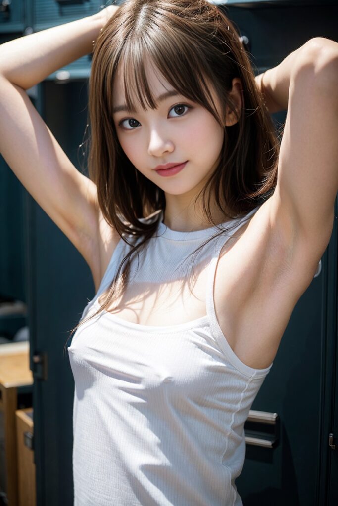 AI腋画像かわいい子の腋、そしておっぱいは小さめ。乳首は出していない、というようなAI生成画像です。路地裏の腋画像と似たような感じです。