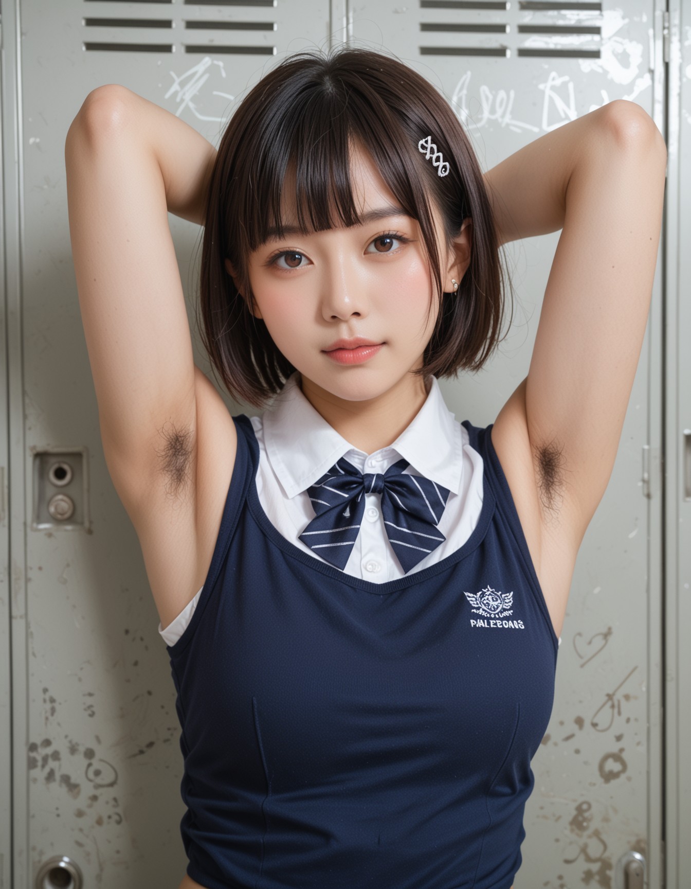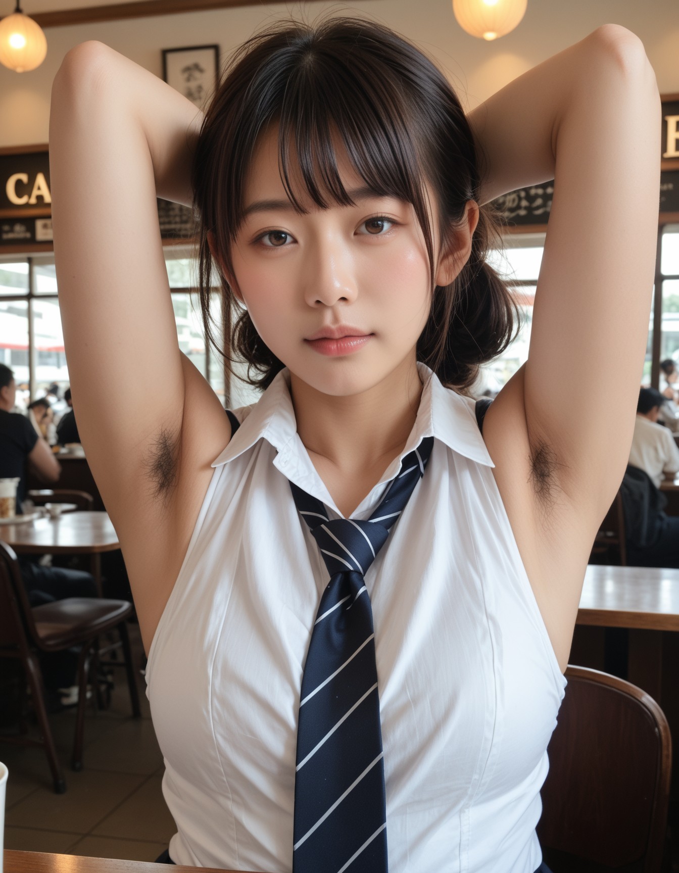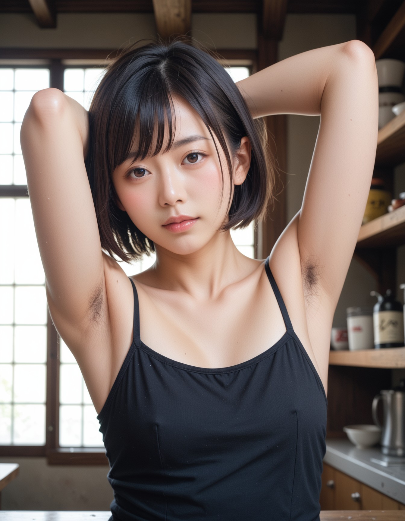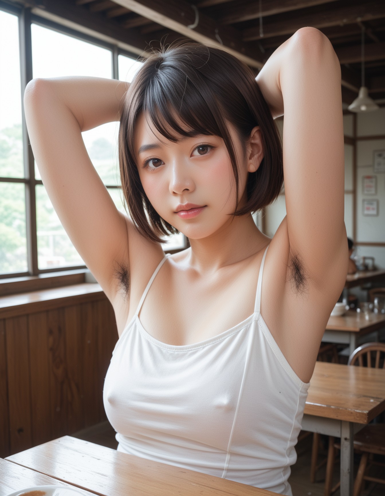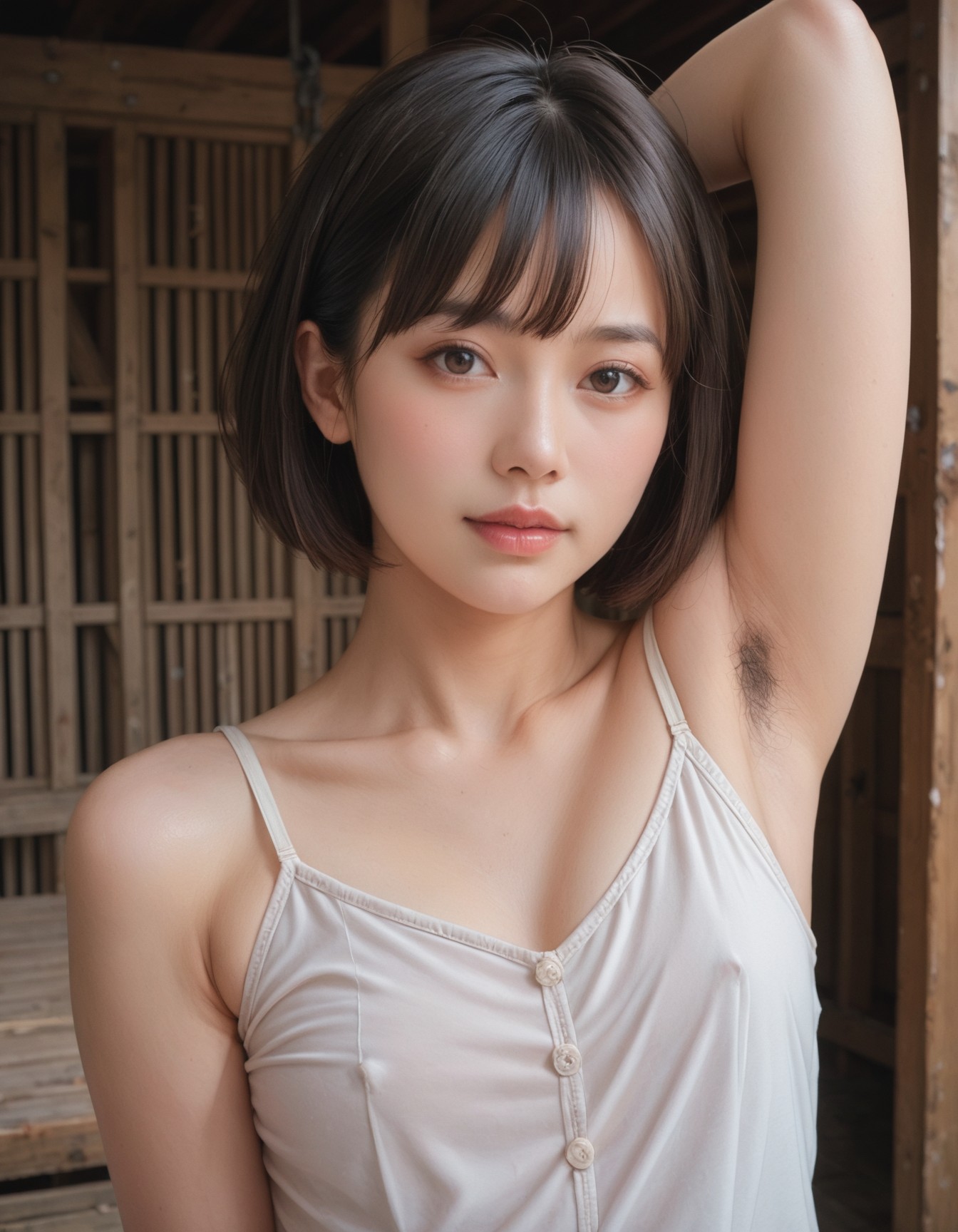 AI美女の腋毛画像です。腋毛フェチというのは世の中にそんなに多くないのだろうと思います。思えばわたしの友達でも腋毛が好きだという人はほとんどいませんでした。中学の時の友人であるN君はとても腋が好きでクラスの女子の腋毛の処理跡がどれくらいの長さになっているかというのを細かく観察してわたしに情報を提供してくれました。しかし、そのN君以外の人と女性の腋について語り合ったことはありません。N君とは中学卒業以降、疎遠になってしまってわたしの腋フェチは孤独なものになりました。今は、インターネットという便利なものがありますので同好の士を見つけることはたやすいでしょう。そういう点においてはとても便利な世の中になりました。
