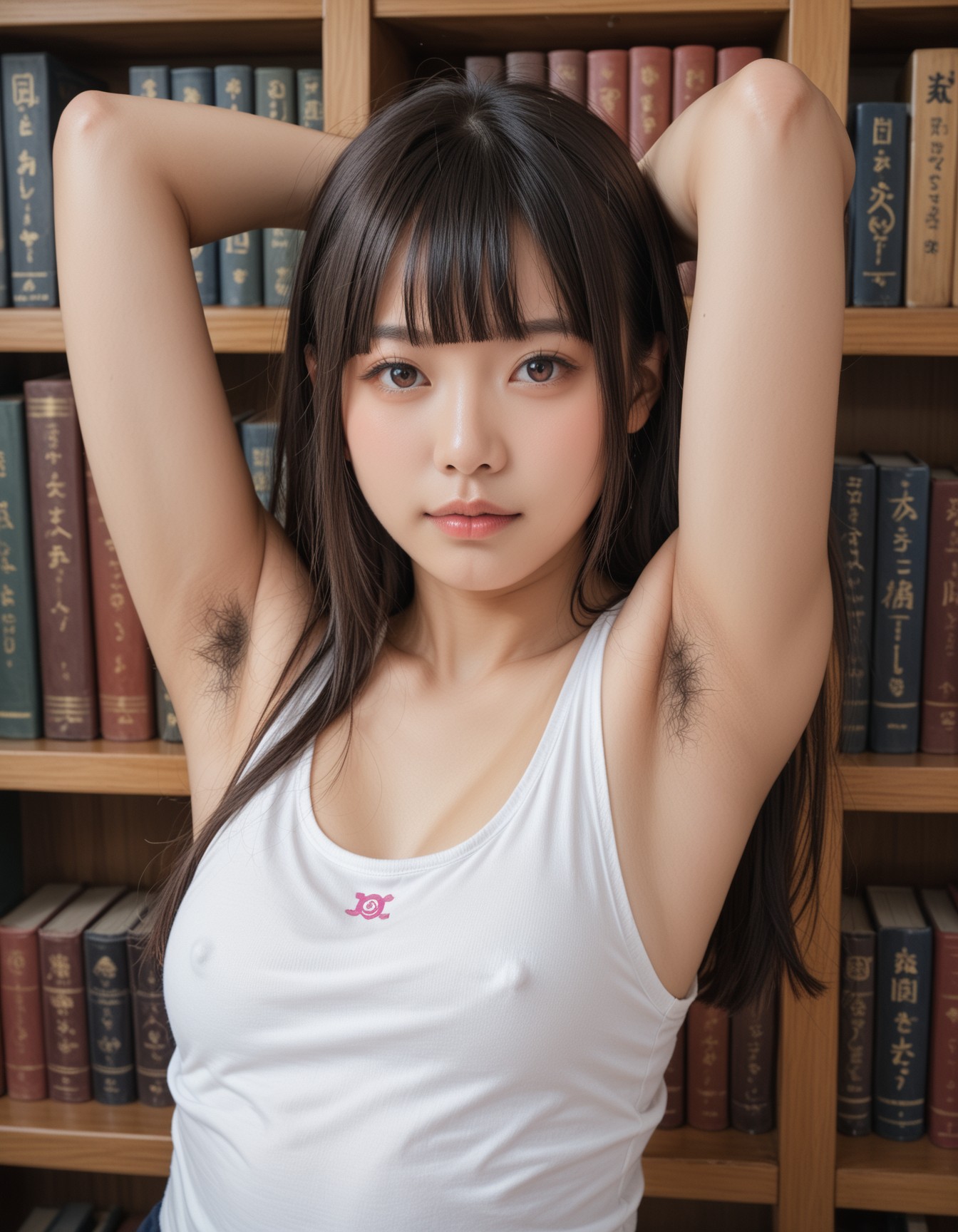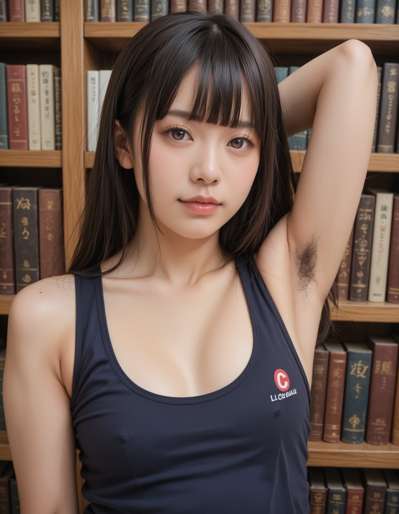 score_9, score_8_up, score_7_up, photorealistic, high resolution, highly detailed face, japanese female idol, blunt bangs, arm behind head, hairy armpit hair, tank top, upper body, A small wooden library, Nostalgic and melancholic atmosphere