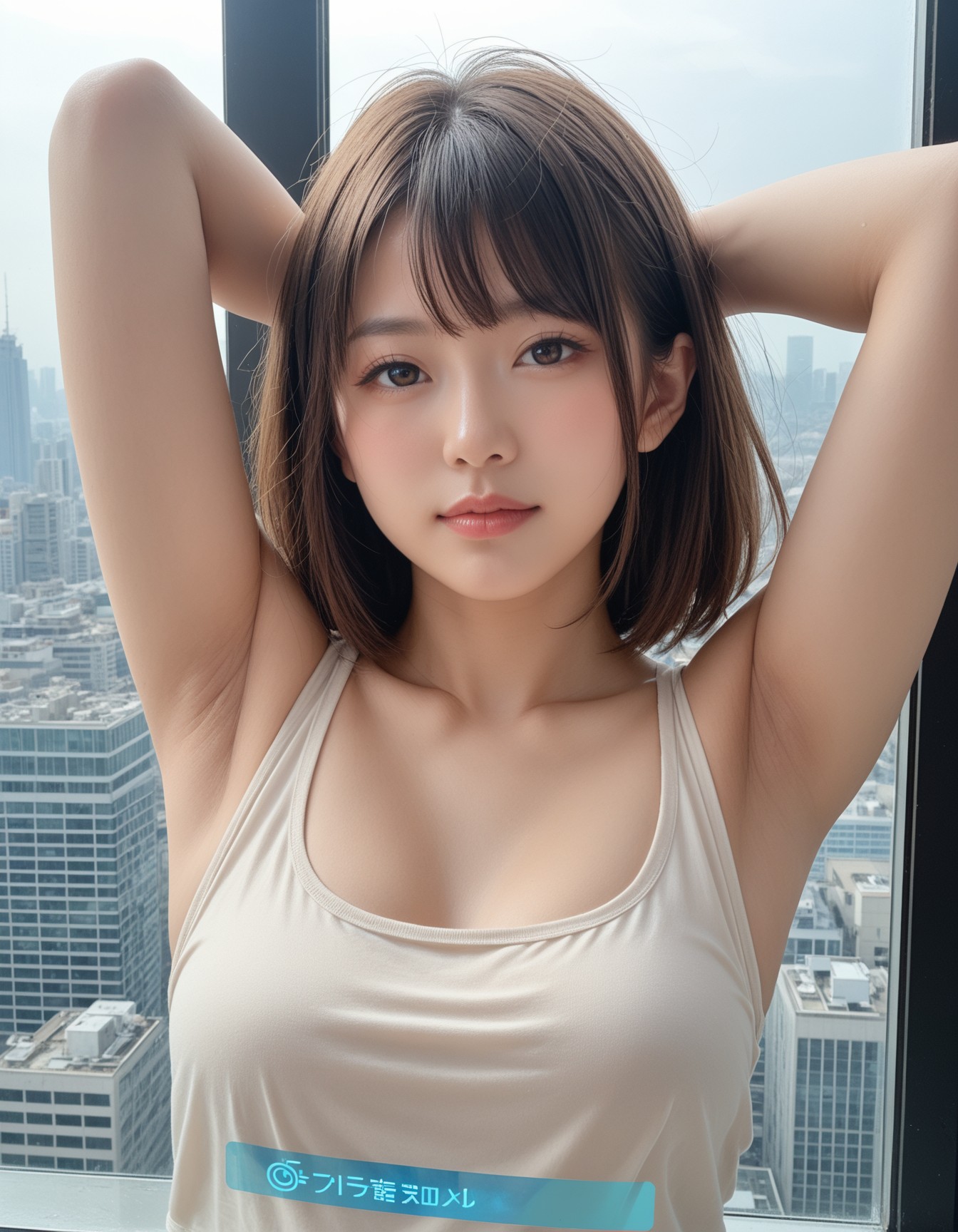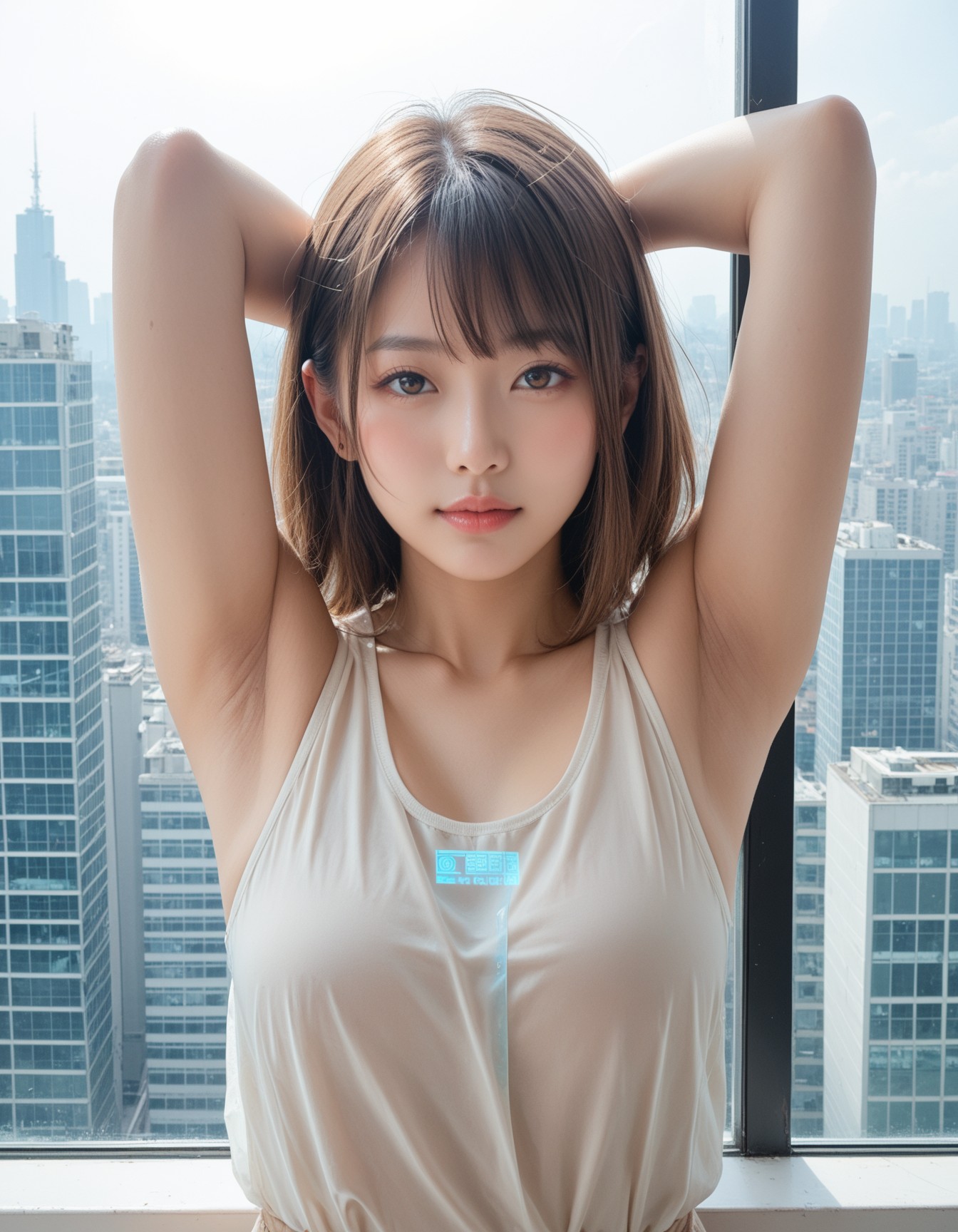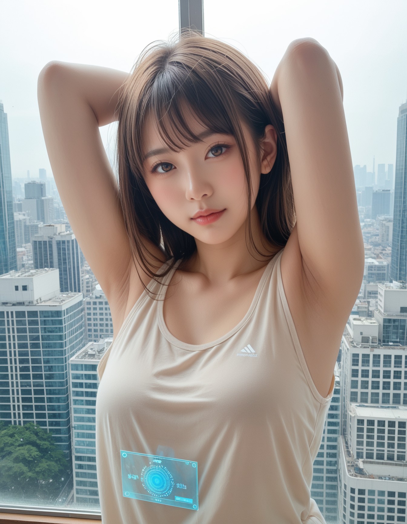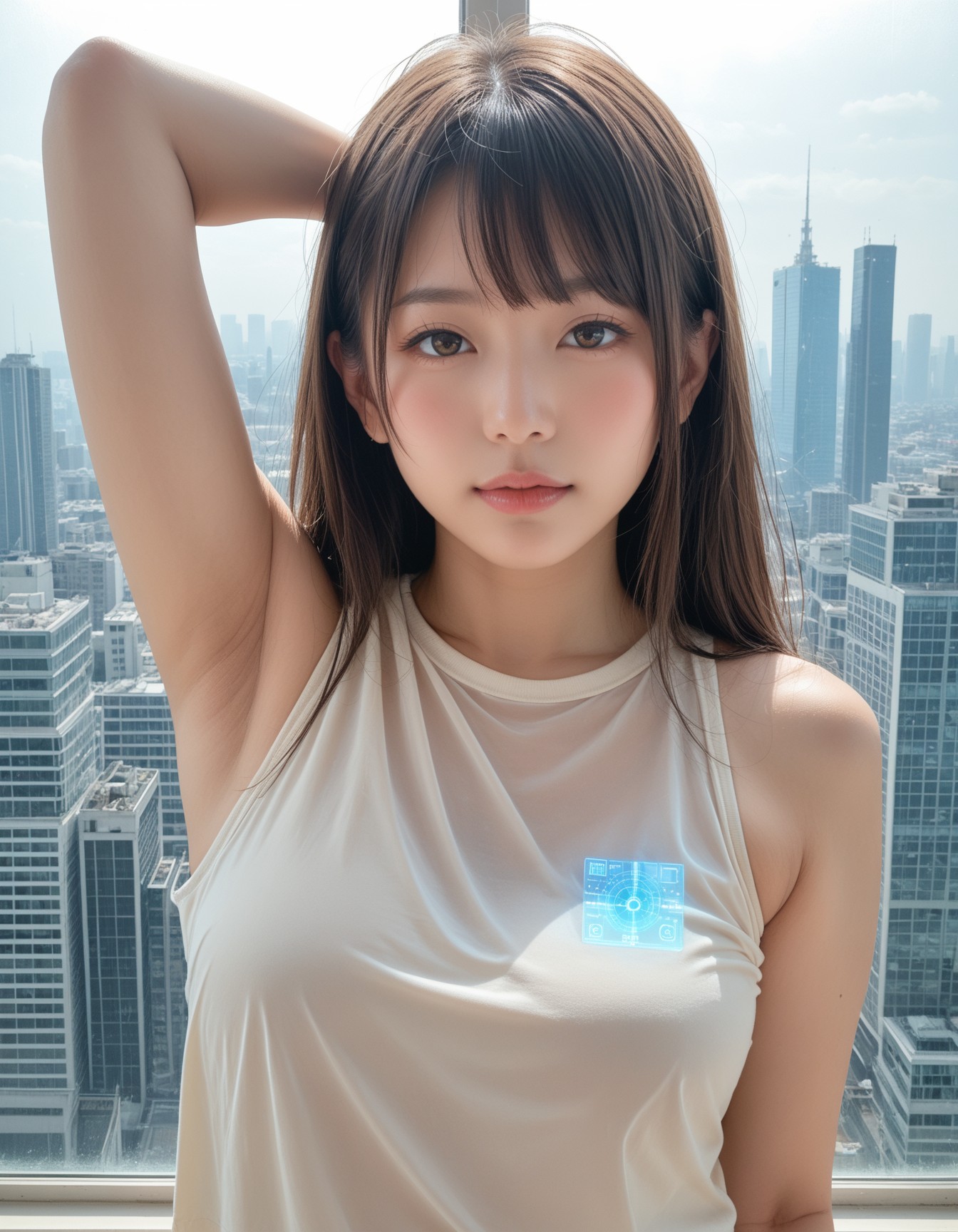 score_9, score_8_up, score_7_up, photo of japanese female idol, front view, arm behind head, dark armpit, Light beige sleeveless top, upper body, holographic city view through window, glass walls