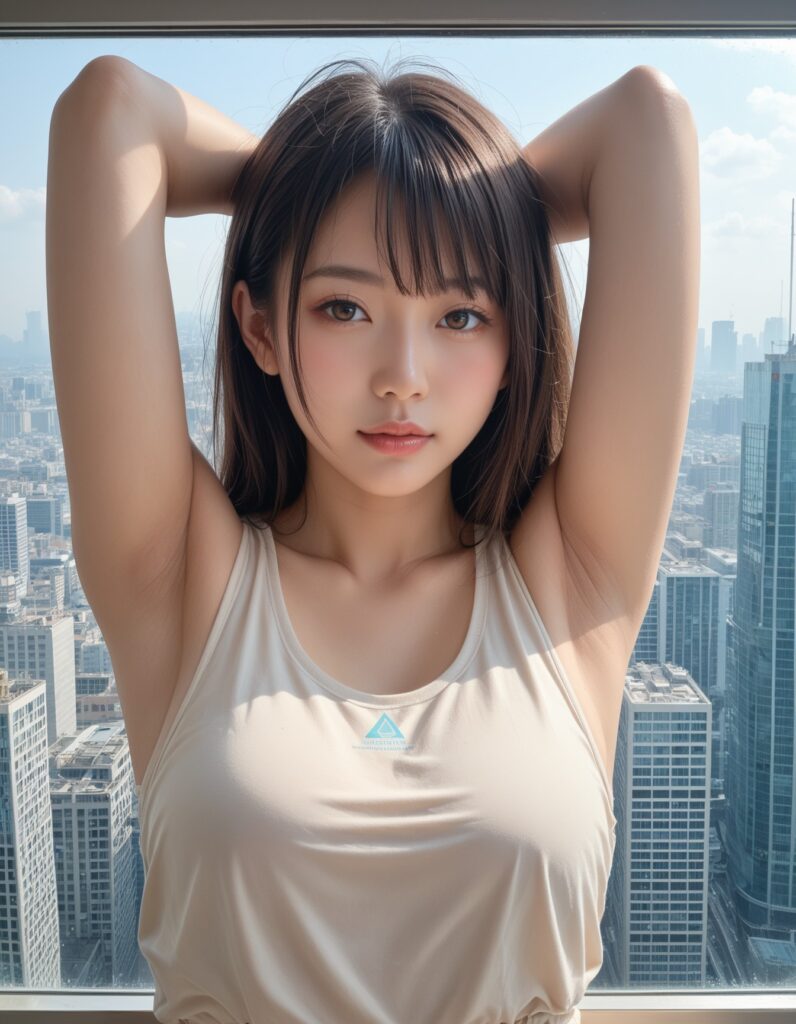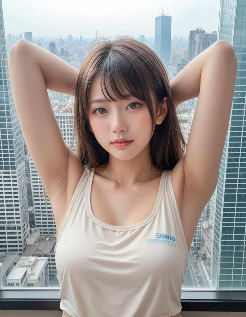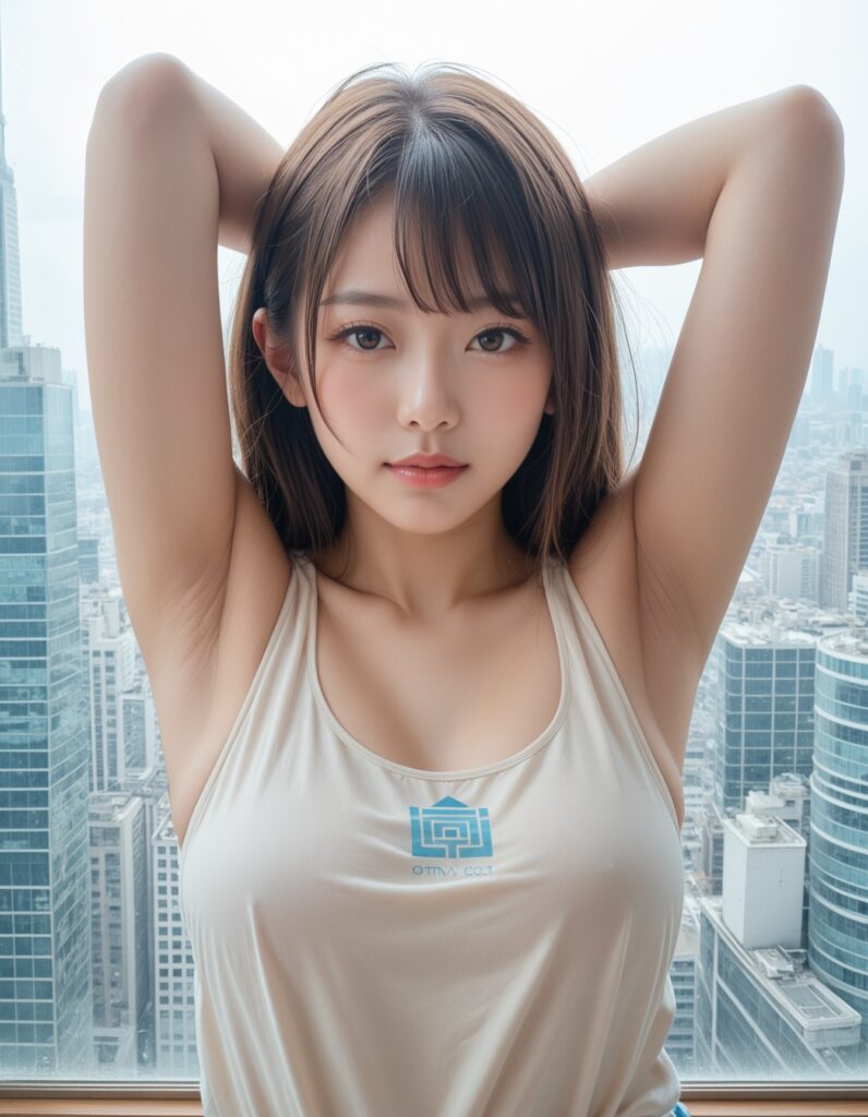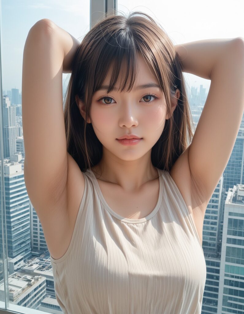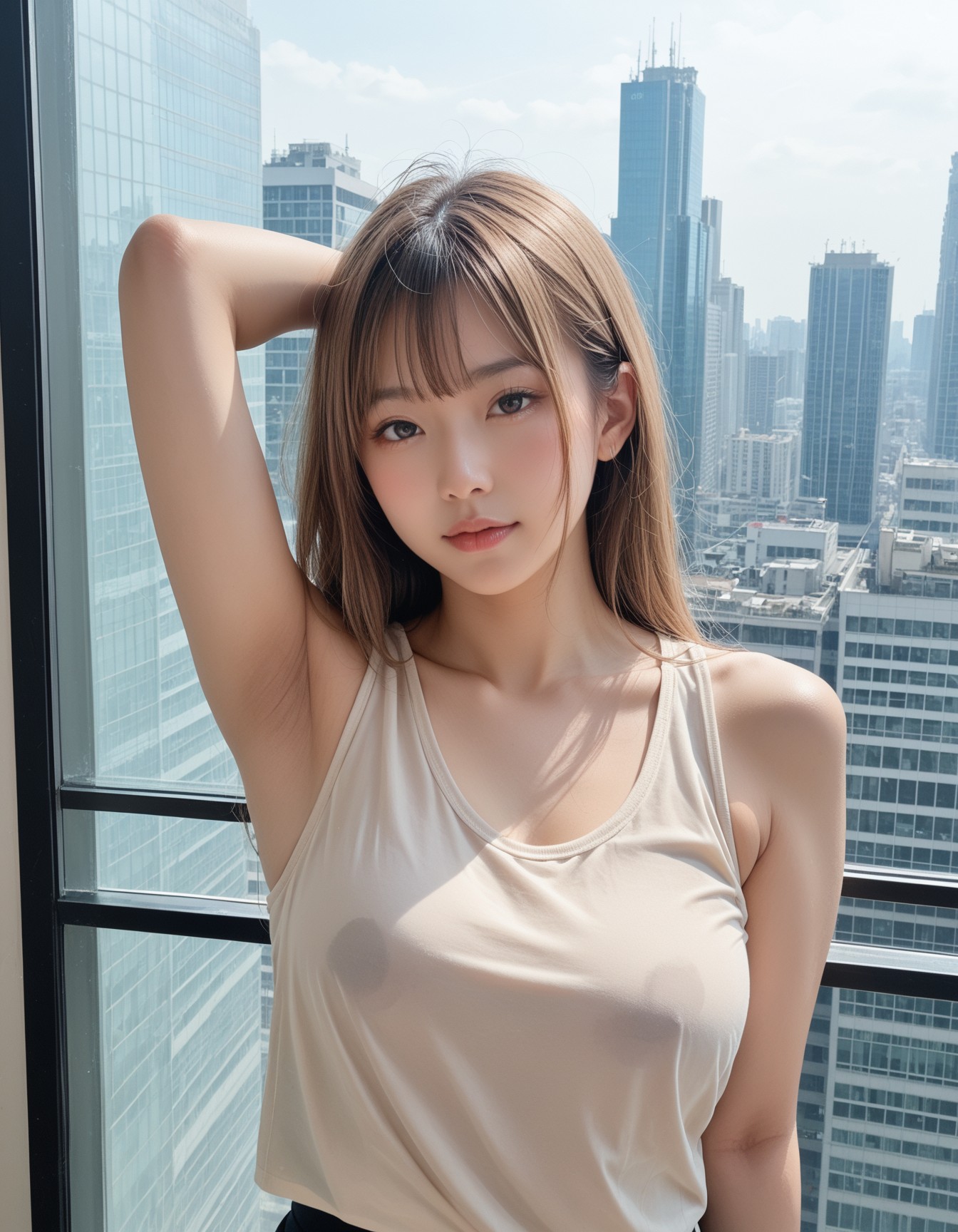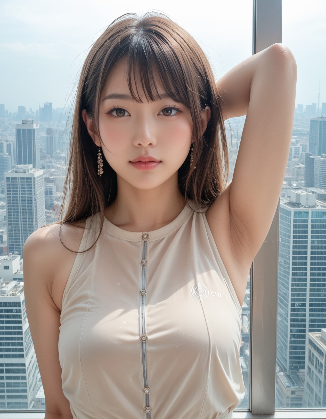 score_9, score_8_up, score_7_up, photo of japanese female idol, front view, arm behind head, dark armpit, Light beige sleeveless top, upper body, holographic city view through window, glass walls