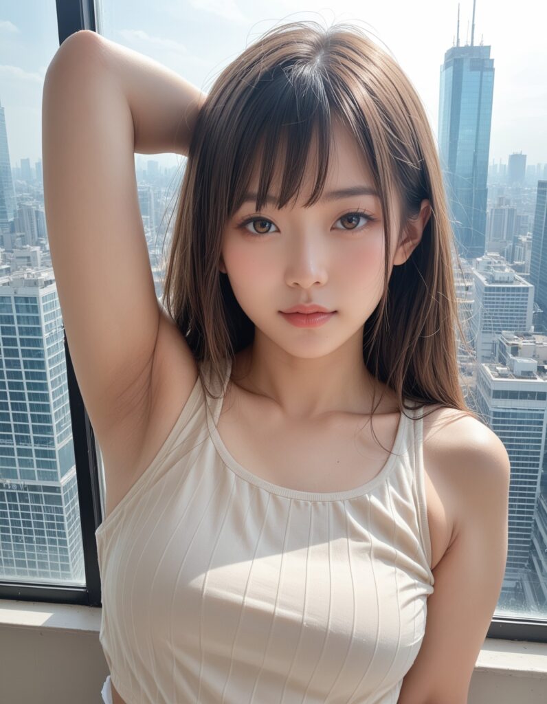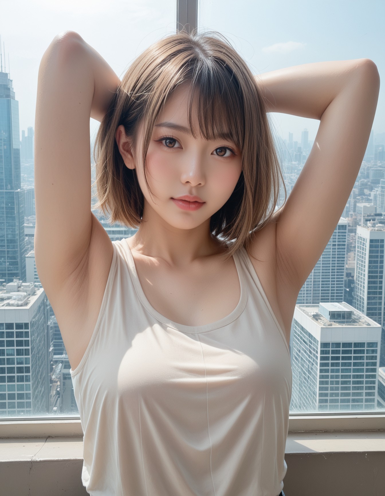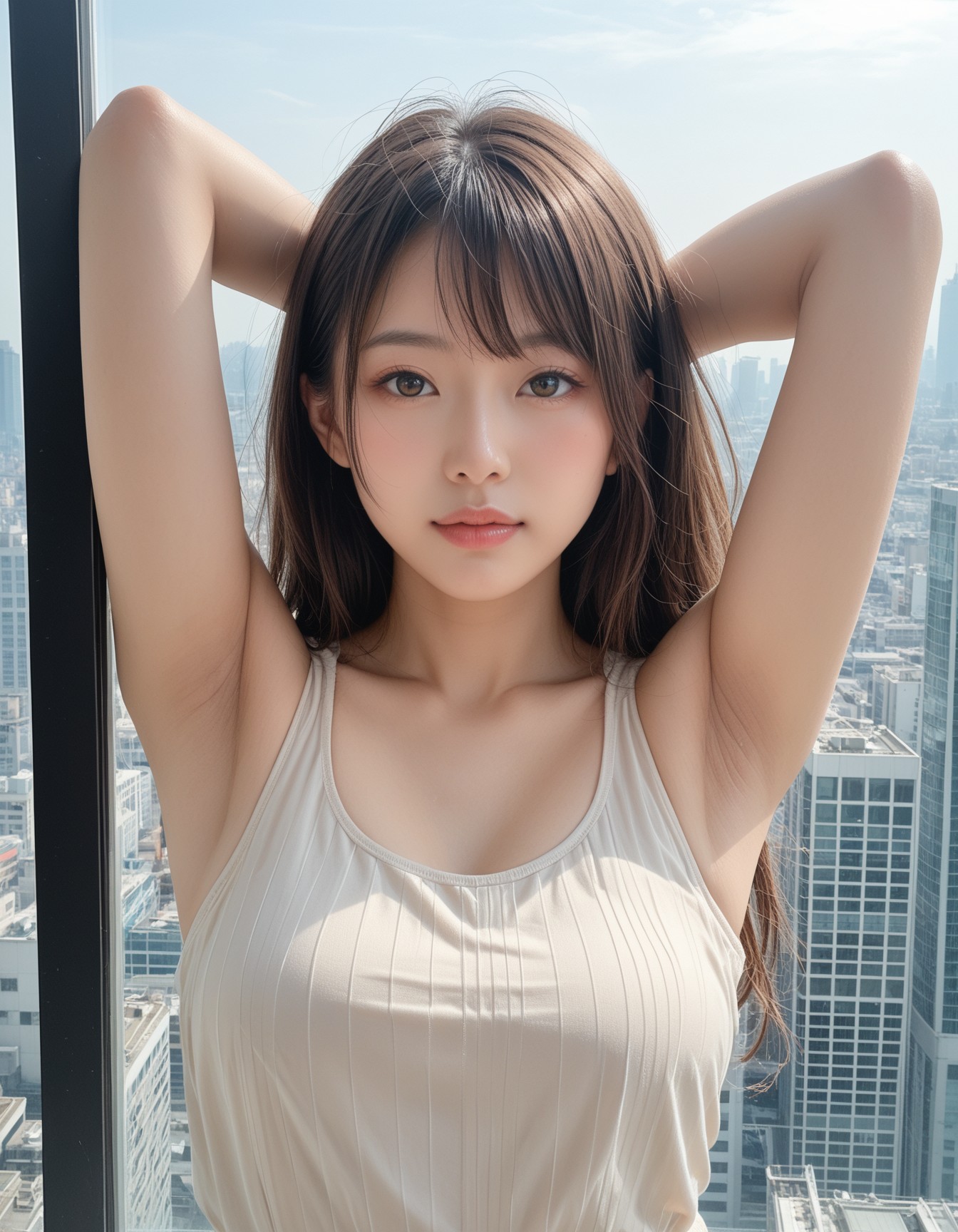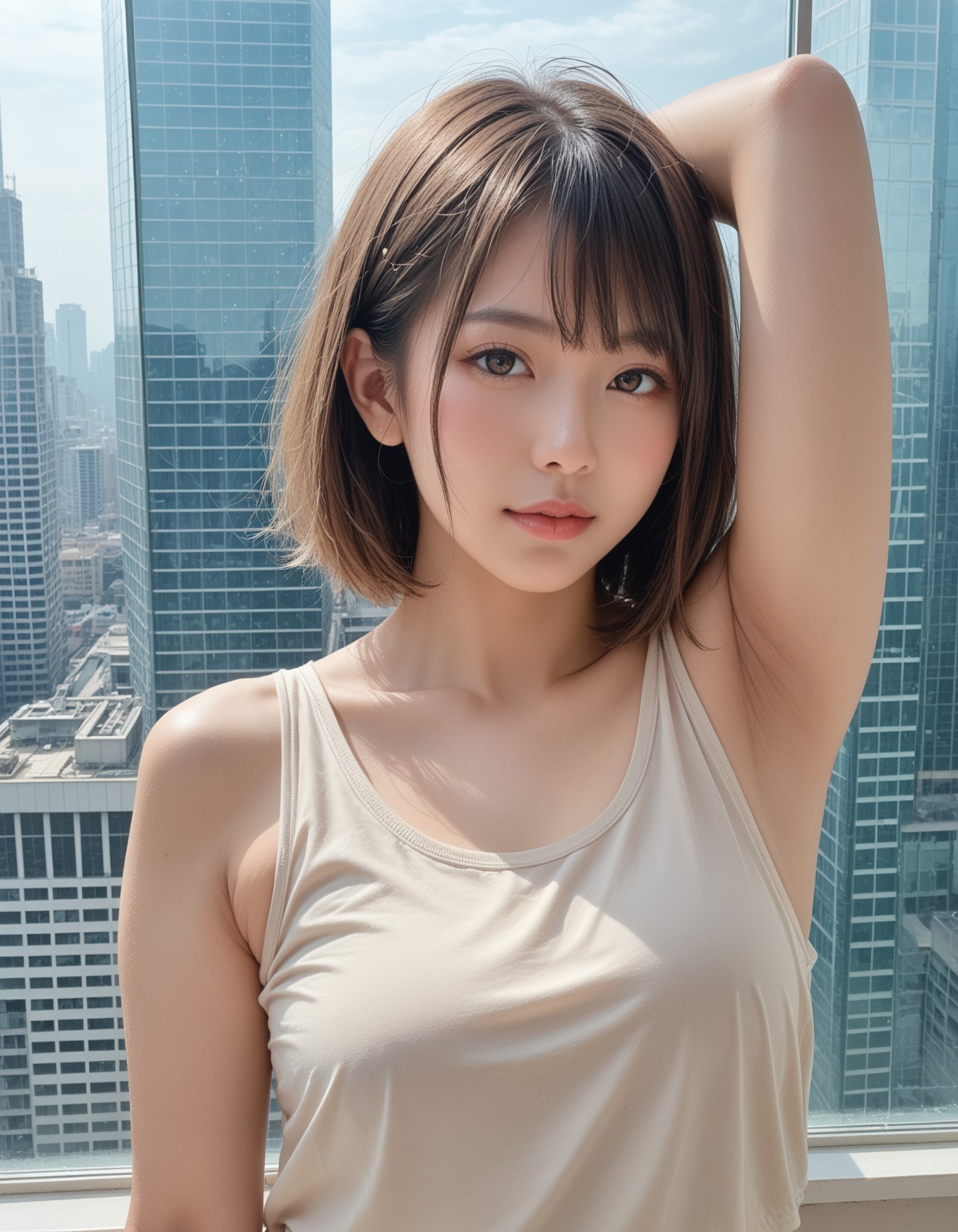 score_9, score_8_up, score_7_up, photo of japanese female idol, front view, arm behind head, dark armpit, Light beige sleeveless top, upper body, holographic city view through window, glass walls