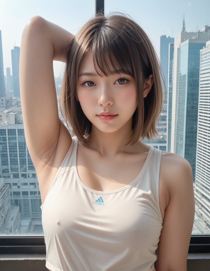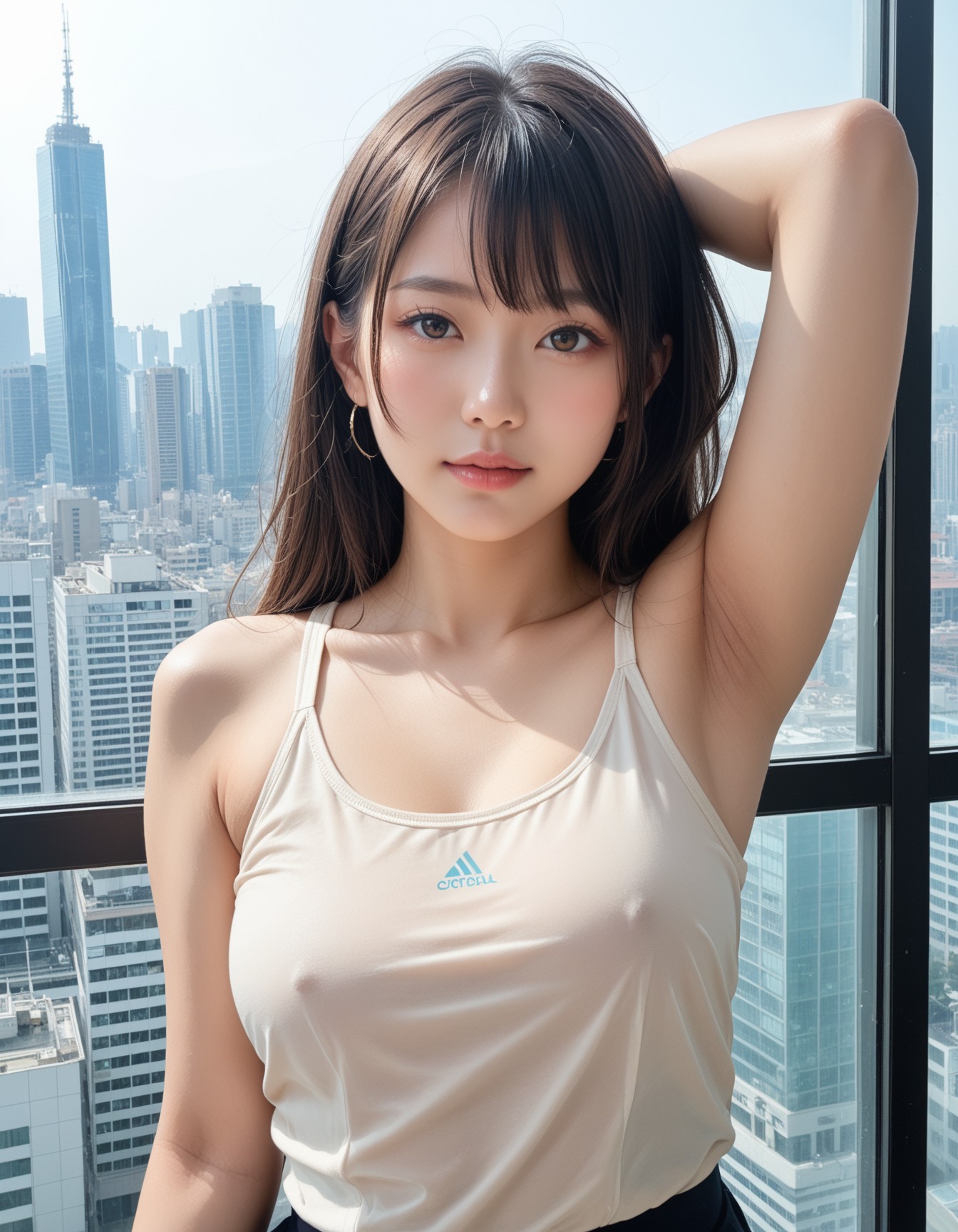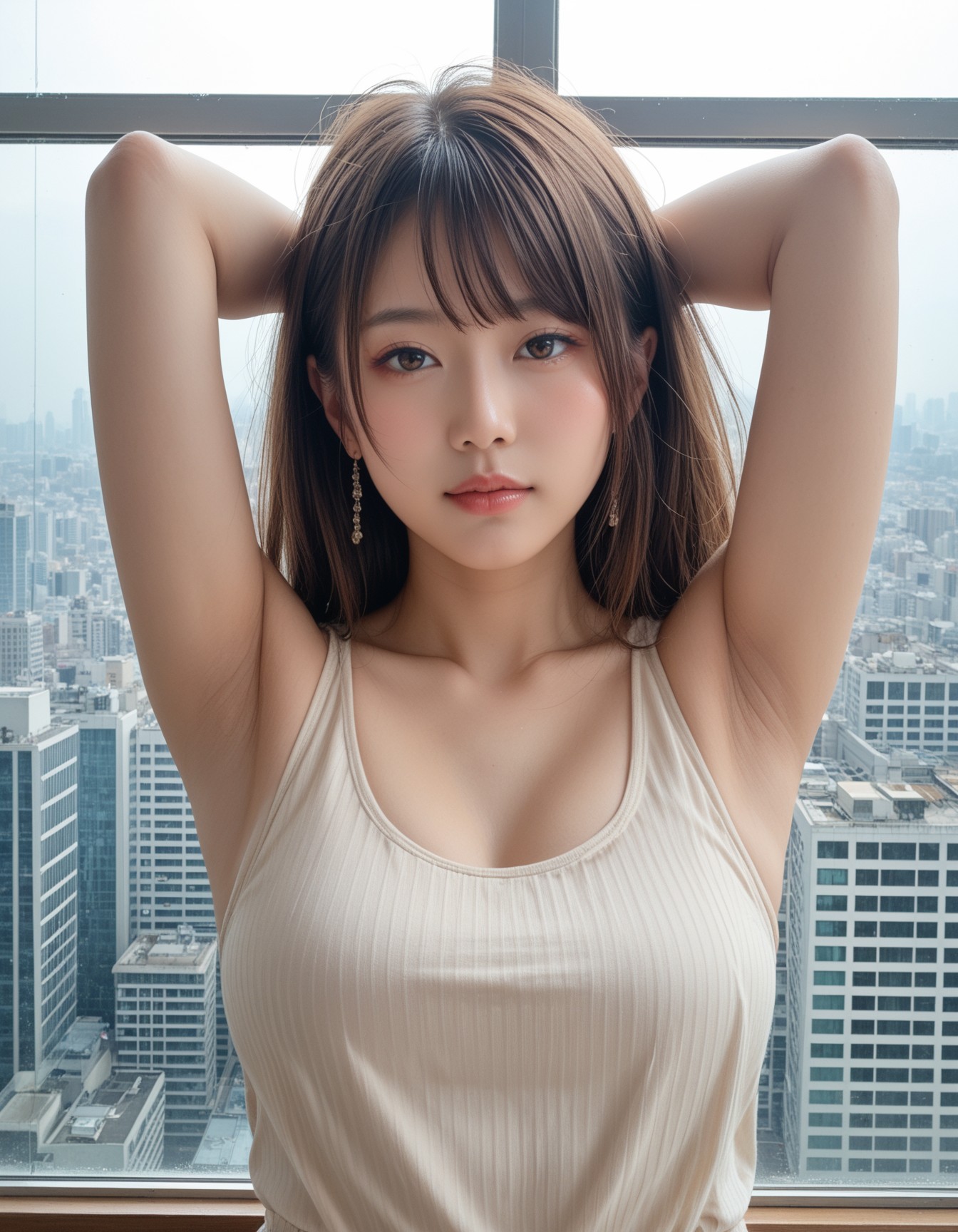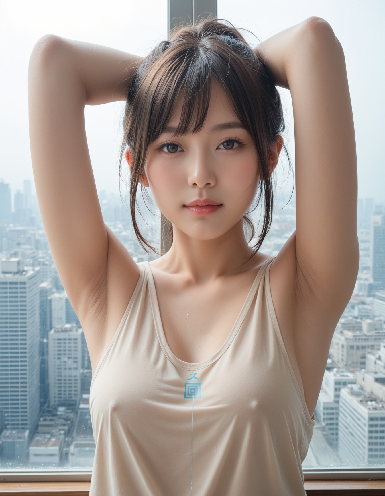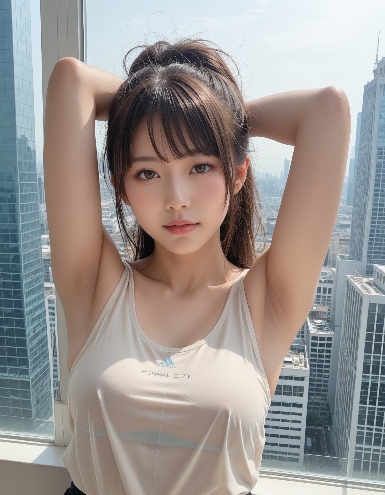 score_9, score_8_up, score_7_up, photo of japanese female idol, front view, arm behind head, dark armpit, Light beige sleeveless top, upper body, holographic city view through window, glass walls