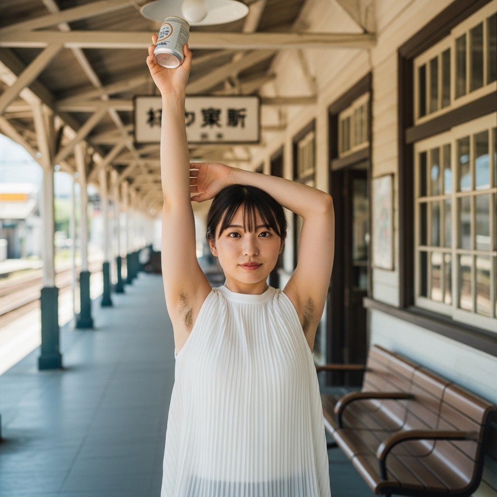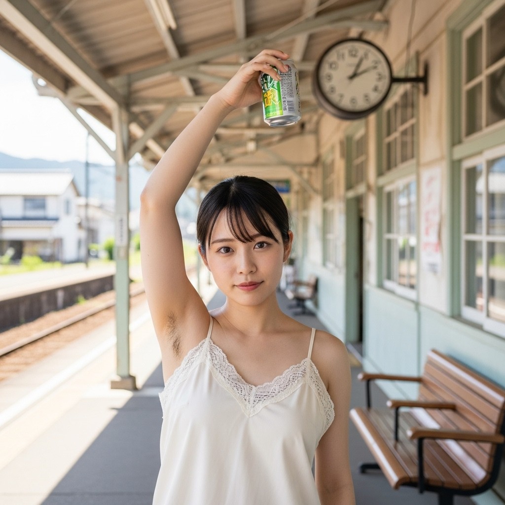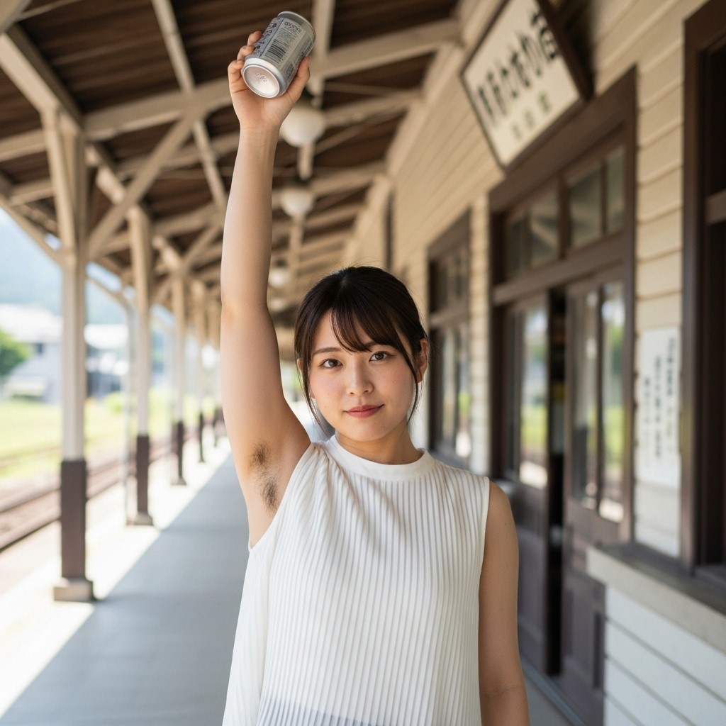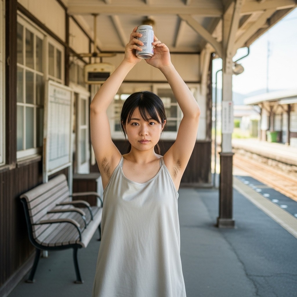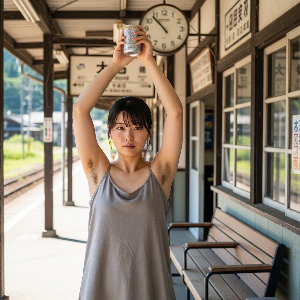 夏の午後、田舎の古い駅は静まり返っていた。古びた木造のホームに降り立った瞬間、蒸し暑い風が頰を撫で、遠くの蝉の声だけが響く。そこに、彼女が立っていた。地元の人らしい、二十代半ばくらいだろうか。ピンクのタンクトップは汗で薄く肌に張りつき、胸の膨らみを柔らかく浮かび上がらせている。腕を大きく上に伸ばし、冷えた缶ジュースをまるでトロフィーのように掲げていた。黒く、濃く、艶やかに生えそろった腋毛。蒸れた夏の湿気を含んで、細かな汗の粒が毛先に光っている。自然で、野性的で、まるでその土地の土の匂いのように濃厚だった。