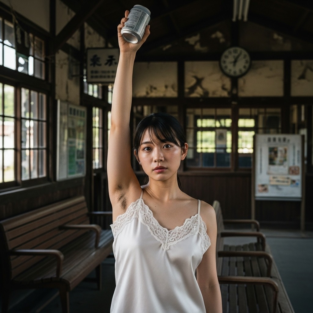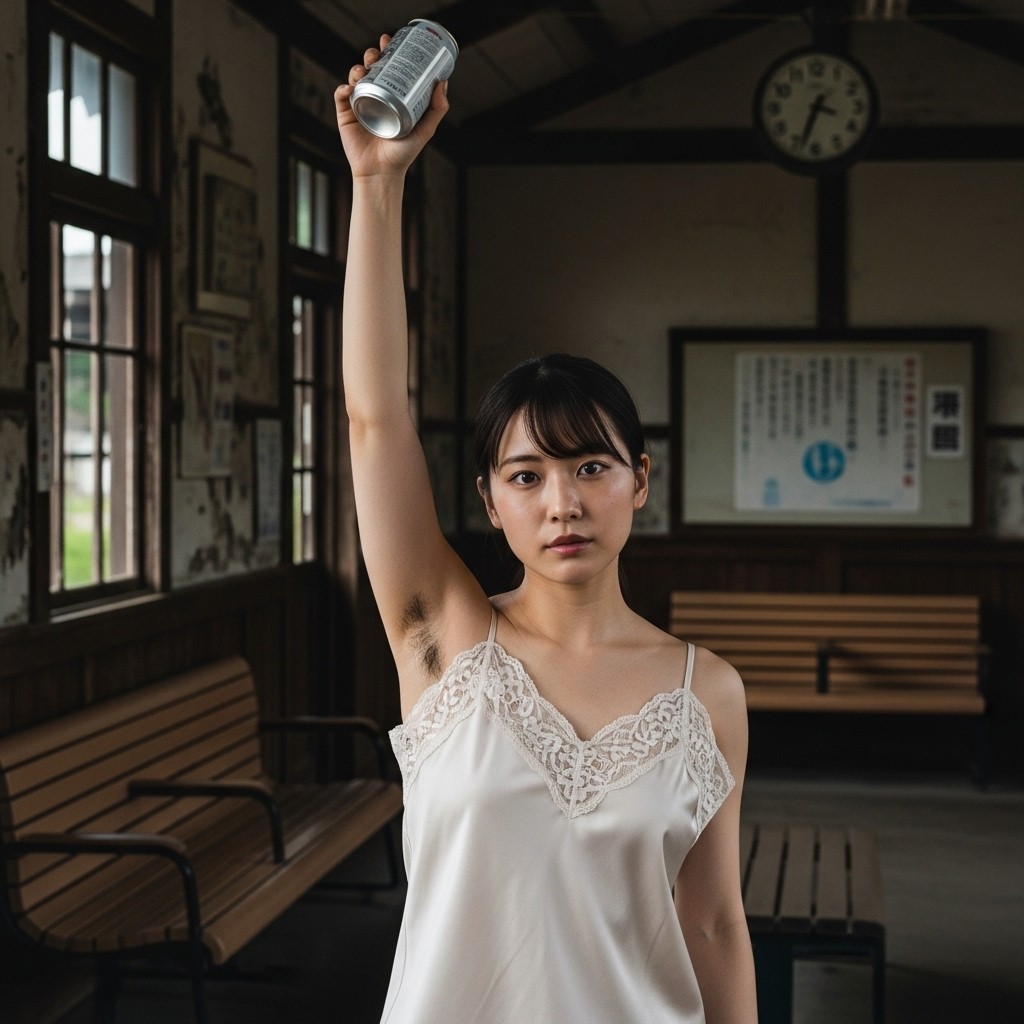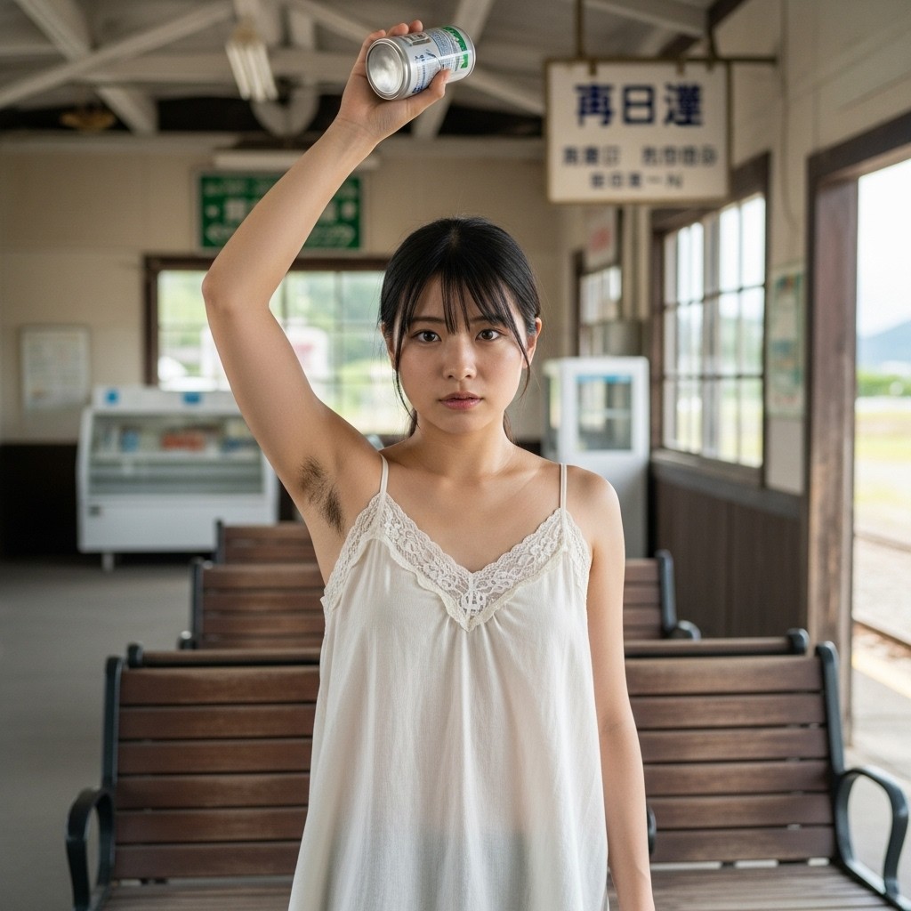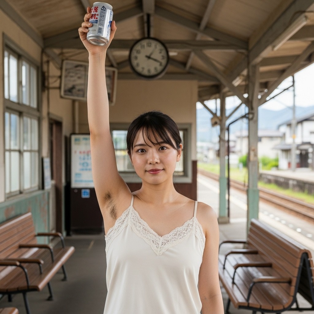 夏の午後、田舎の古い駅は静まり返っていた。古びた木造のホームに降り立った瞬間、蒸し暑い風が頰を撫で、遠くの蝉の声だけが響く。そこに、彼女が立っていた。地元の人らしい、二十代半ばくらいだろうか。ピンクのタンクトップは汗で薄く肌に張りつき、胸の膨らみを柔らかく浮かび上がらせている。腕を大きく上に伸ばし、冷えた缶ジュースをまるでトロフィーのように掲げていた。黒く、濃く、艶やかに生えそろった腋毛。蒸れた夏の湿気を含んで、細かな汗の粒が毛先に光っている。自然で、野性的で、まるでその土地の土の匂いのように濃厚だった。