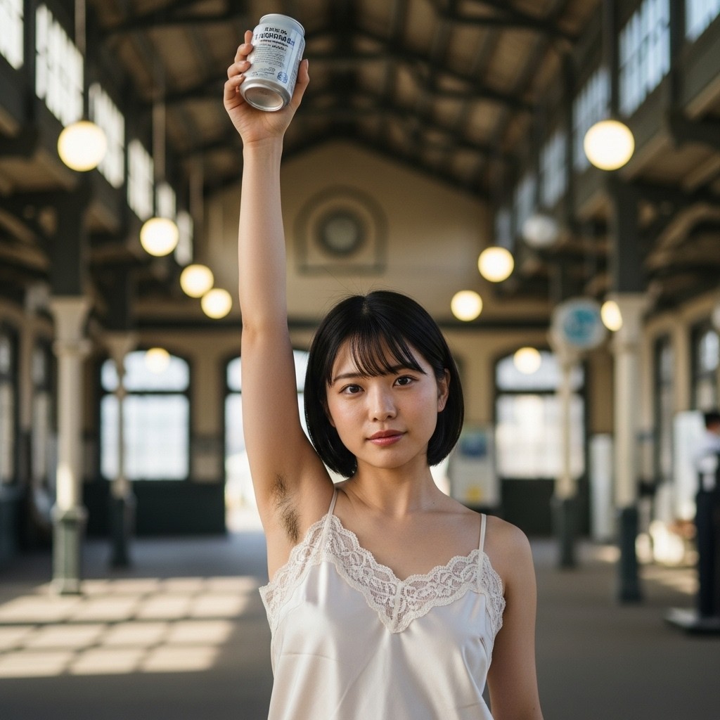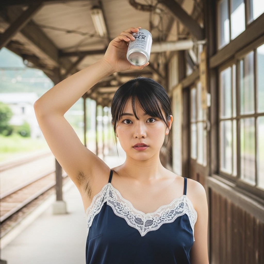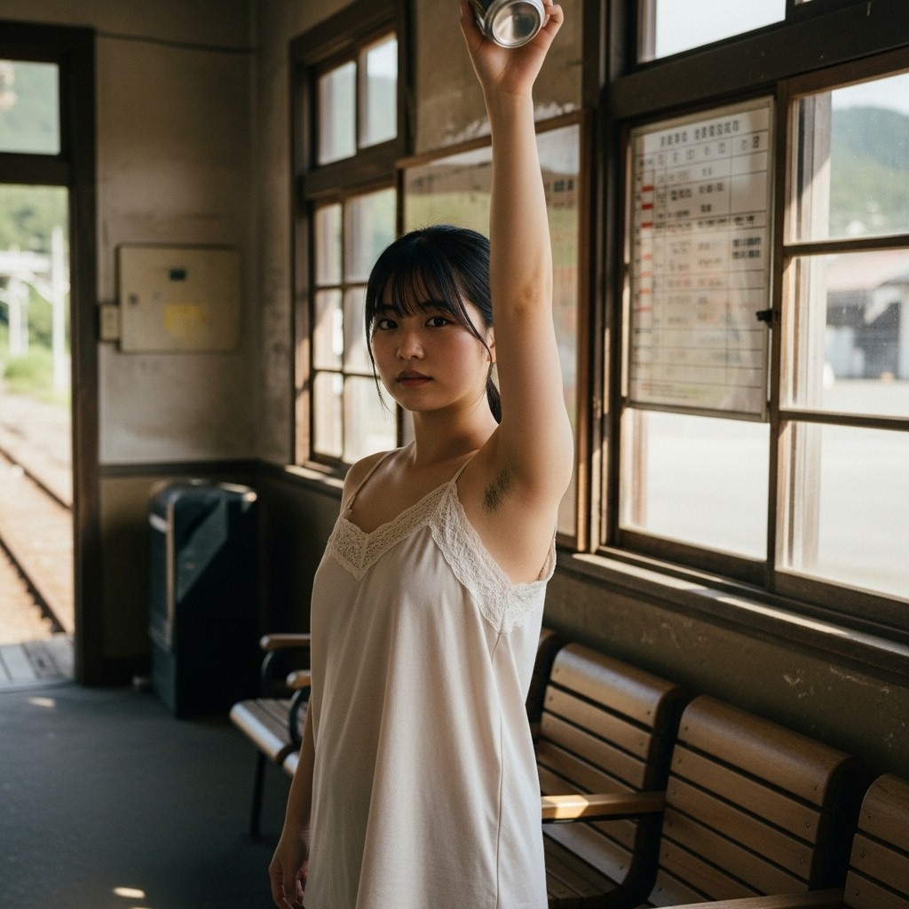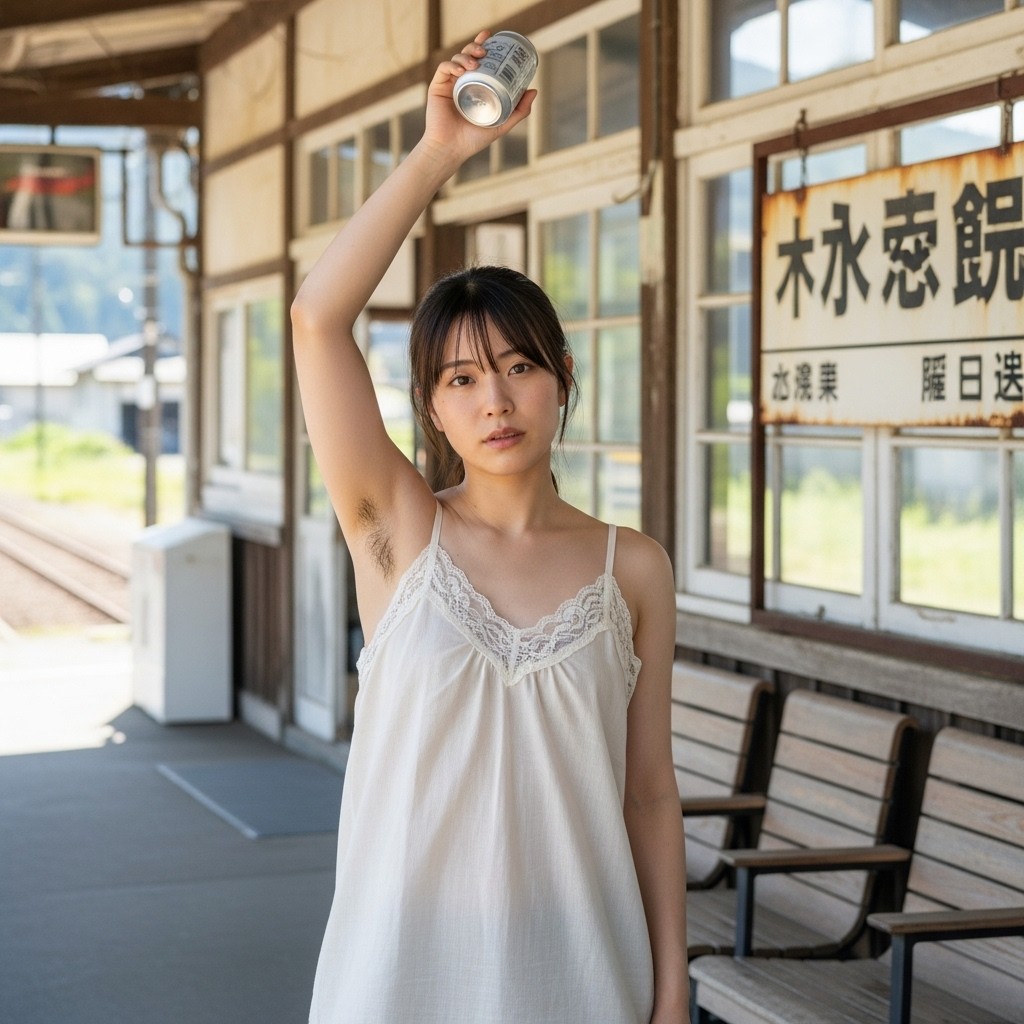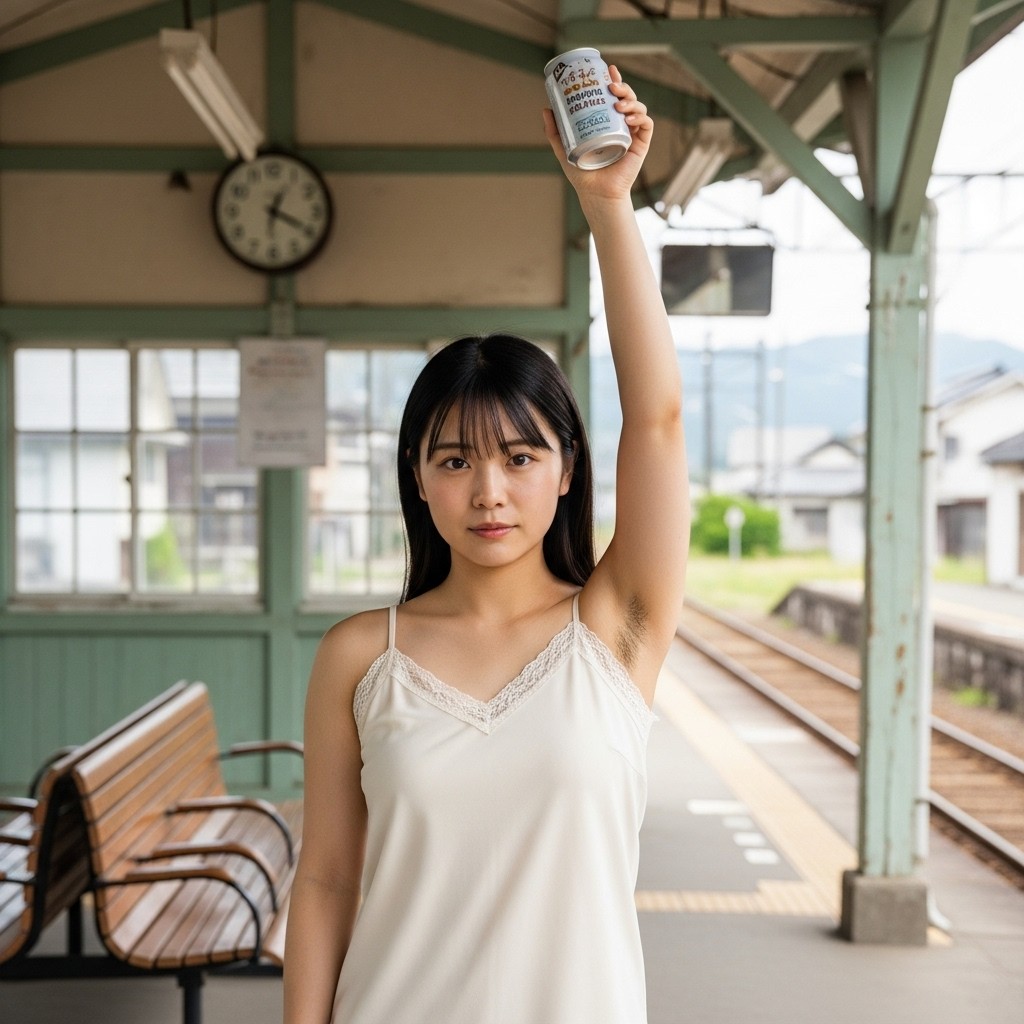 夏の午後、田舎の古い駅は静まり返っていた。古びた木造のホームに降り立った瞬間、蒸し暑い風が頰を撫で、遠くの蝉の声だけが響く。そこに、彼女が立っていた。地元の人らしい、二十代半ばくらいだろうか。ピンクのタンクトップは汗で薄く肌に張りつき、胸の膨らみを柔らかく浮かび上がらせている。腕を大きく上に伸ばし、冷えた缶ジュースをまるでトロフィーのように掲げていた。黒く、濃く、艶やかに生えそろった腋毛。蒸れた夏の湿気を含んで、細かな汗の粒が毛先に光っている。自然で、野性的で、まるでその土地の土の匂いのように濃厚だった。