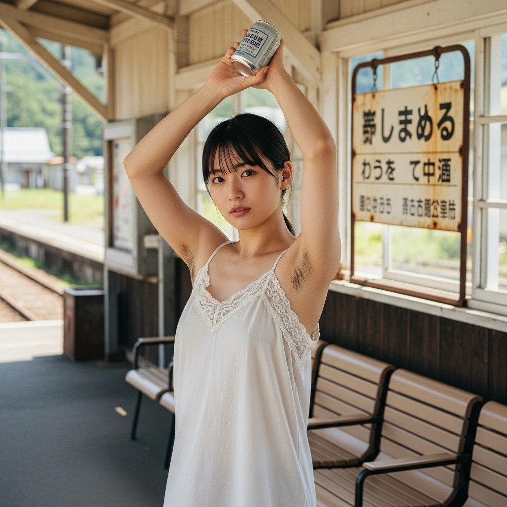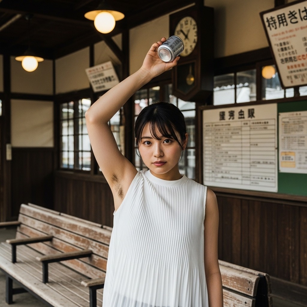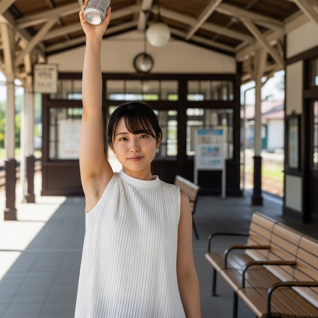close up photo of a Japanese female teacher in her late 20s, wearing a white pleated sleeveless top. arm up, holding a can overhead, revealing natural underarm hair, An old train station in a small town, Retro atmosphere, The photo shows normal skin texture, natural color, and clear sharp lighting