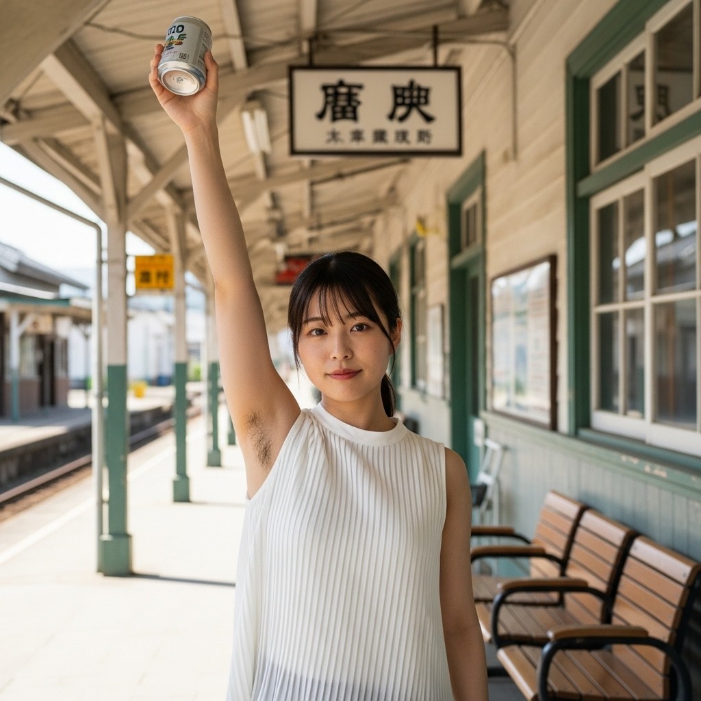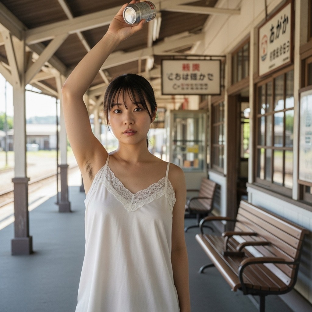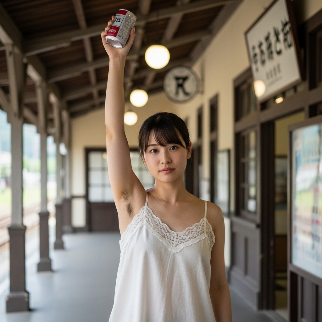 close up photo of a Japanese female teacher in her late 20s, wearing a white pleated sleeveless top. arm up, holding a can overhead, revealing natural underarm hair, An old train station in a small town, Retro atmosphere, The photo shows normal skin texture, natural color, and clear sharp lighting