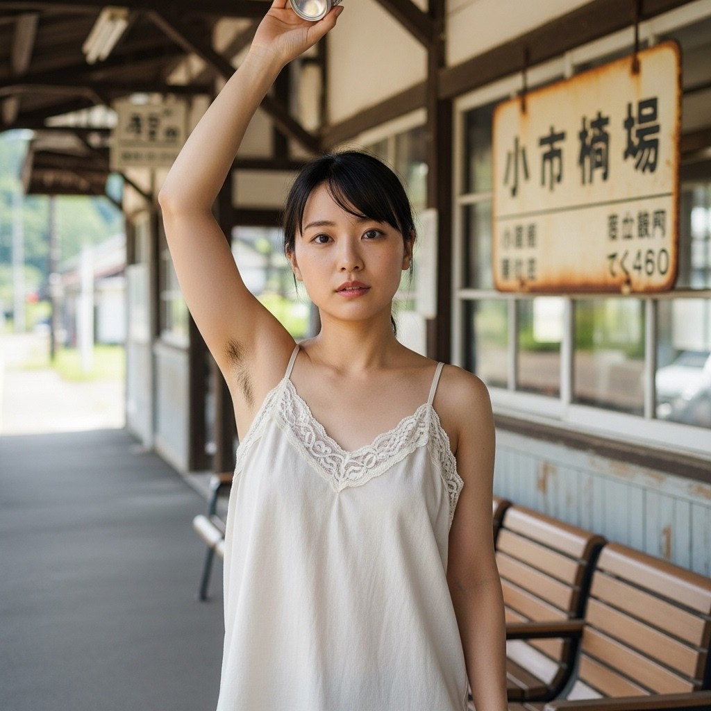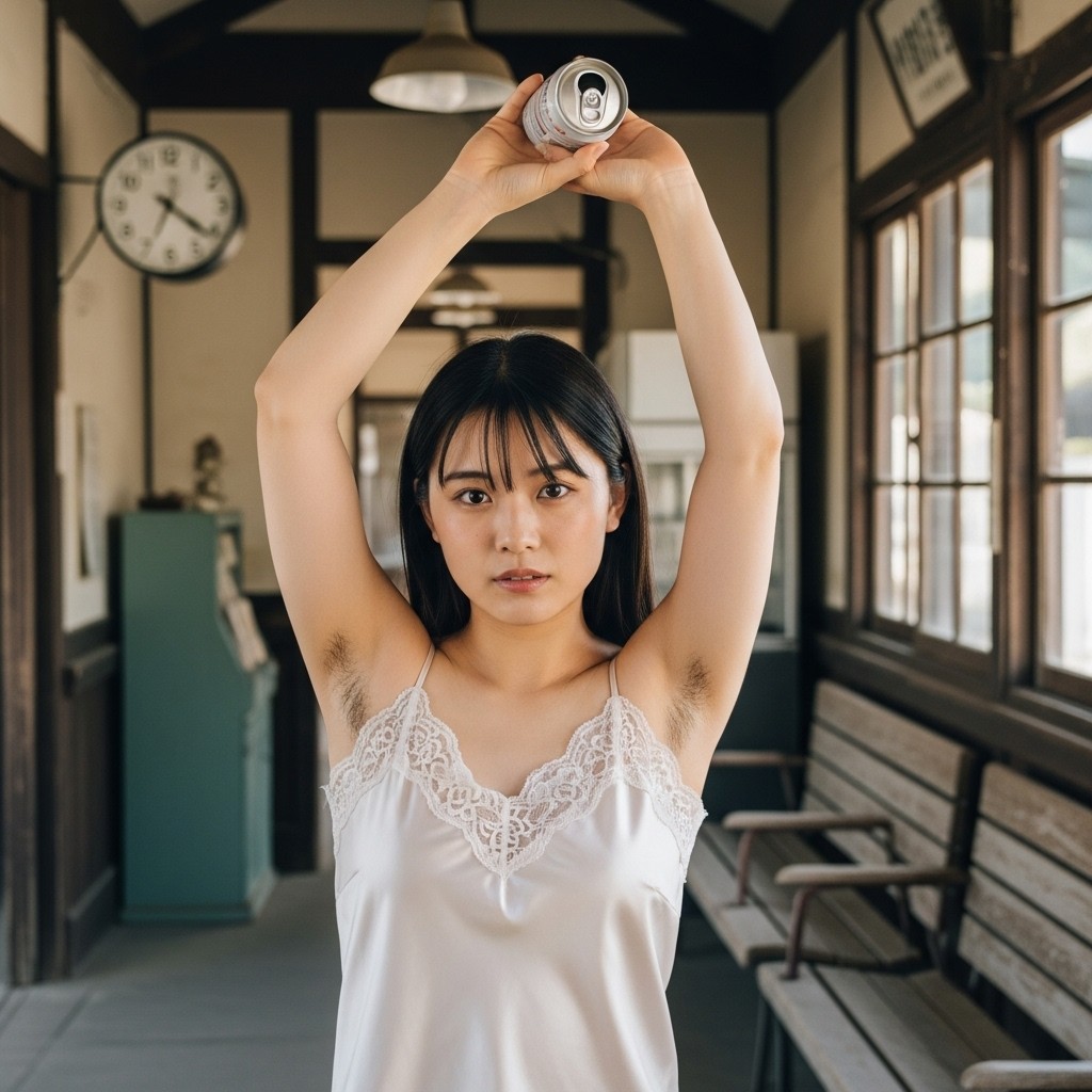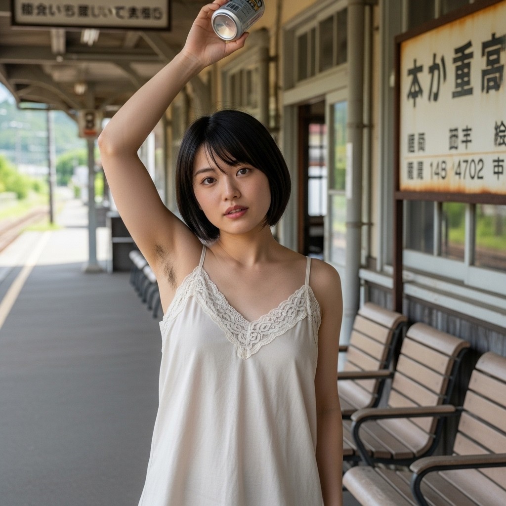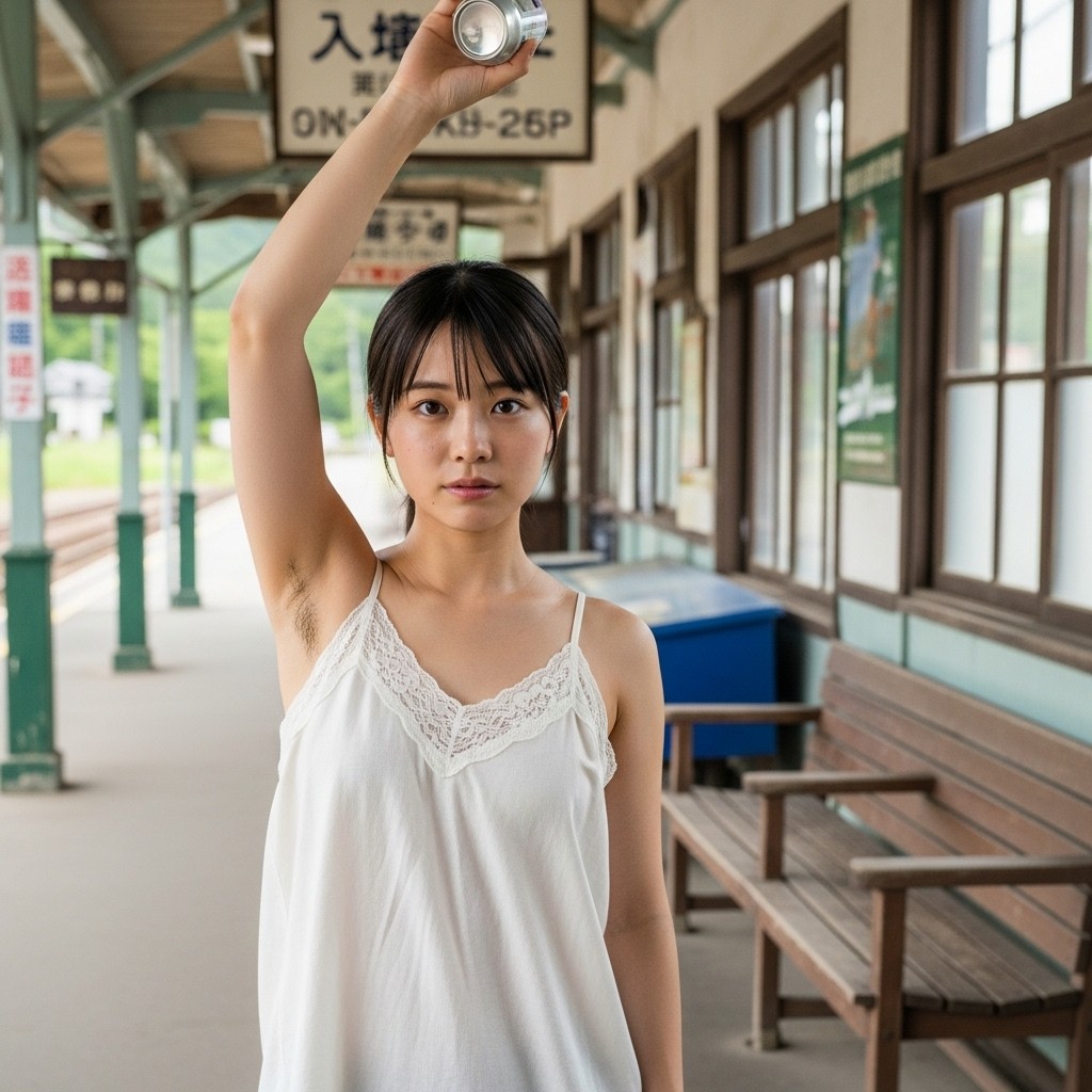 close up photo of a Japanese female teacher in her late 20s, wearing a loose fit camisole with lace trim. arm up, holding a can overhead, revealing natural underarm hair, An old train station in a small town, Retro atmosphere, The photo shows normal skin texture, natural color, and clear sharp lighting