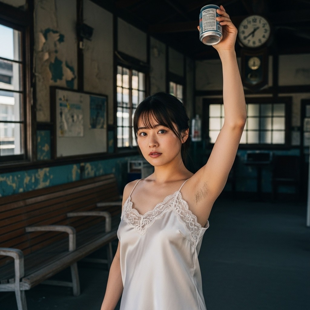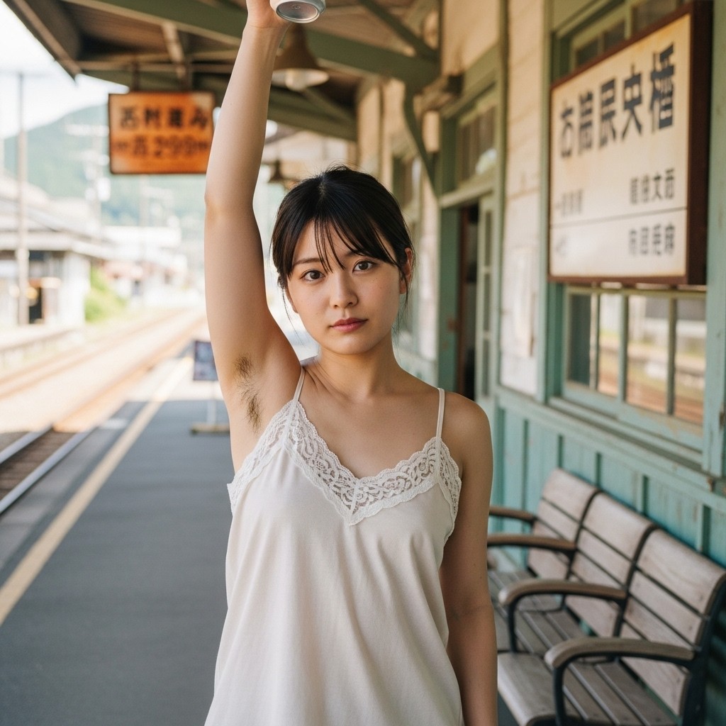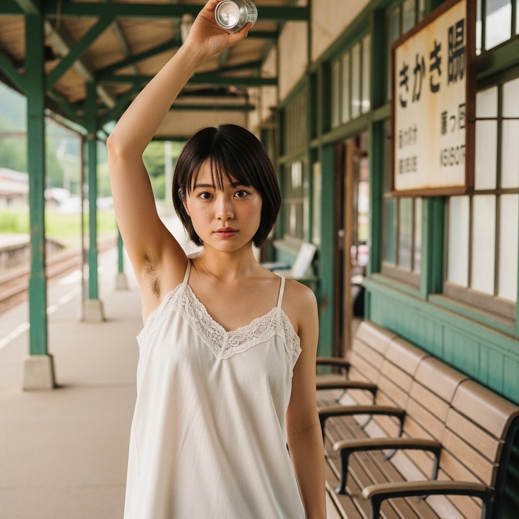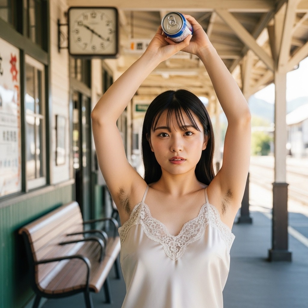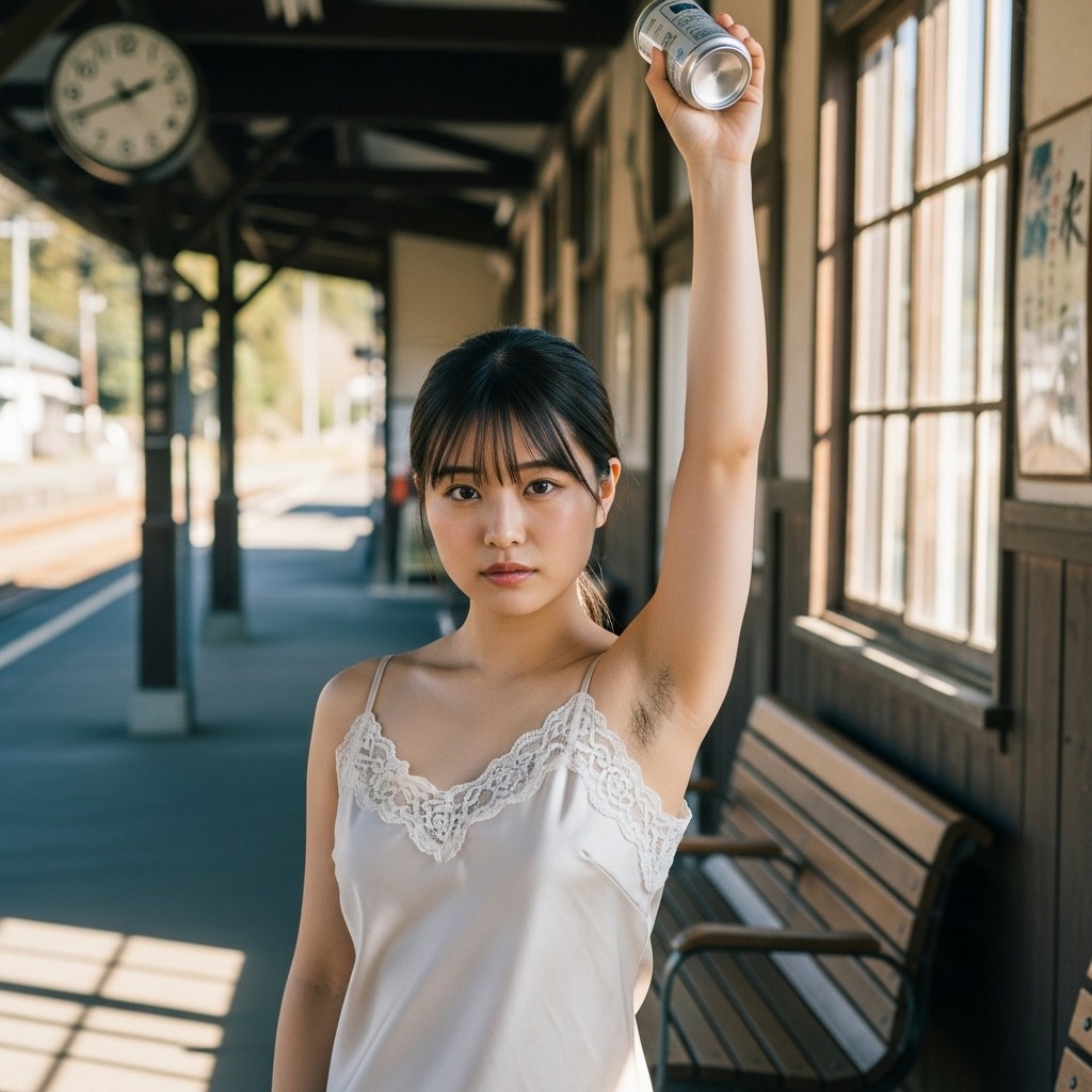 close up photo of a Japanese female teacher in her late 20s, wearing a loose fit camisole with lace trim. arm up, holding a can overhead, revealing natural underarm hair, An old train station in a small town, Retro atmosphere, The photo shows normal skin texture, natural color, and clear sharp lighting