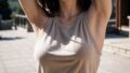 ((Best Quality)), (Realistic:1.2), 8k, high resolution, ((detailed armpit)), hairy armpit, Japanese woman, 42 years old, medium hair, wavy hair, halter neck lily printed top, abandoned changing room