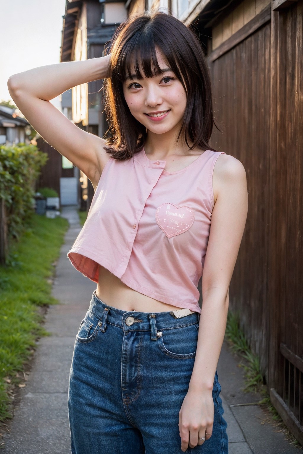 8k, high resolution, photo realistic, (highly detailed, best quality:1.2),RAW photo, (detailed armpit, hairy armpit), 25 years old japanese woman like cute idol, heart shaped cut out shirt, medium hair, bangs, shy smile, sunset, telephone pole, stairs, alleyway of rural japan