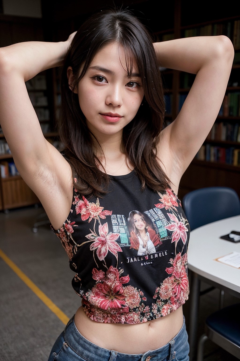 ((Best Quality)), (Realistic:1.2), ((detailed armpit)), hairy armpit, 1japanese woman, 22 years old, cute, sleeveless psychedelic print shirt, upper body, A public library that has been abandoned