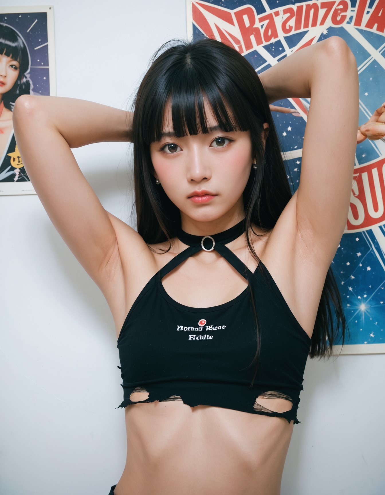 score_9, score_8_up, score_7_up, (masterpiece, best quality:1.2), photorealistic, high resolution, very detailed skin, highly detailed face, beautiful asian woman showing dark armpit, blunt bangs, small breast, halter neck multi color crop top, in 80s retro office space, torn poster, upper body
