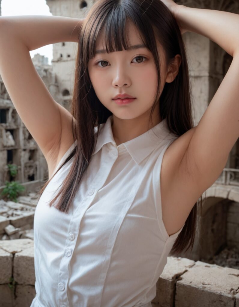 score_9, score_8_up, score_7_up, photorealistic, high resolution, very detailed skin, highly detailed face, asian girl like an idol showing dark armpit, blunt bangs, sleeveless dress shirt, ruins, bridge, upper body