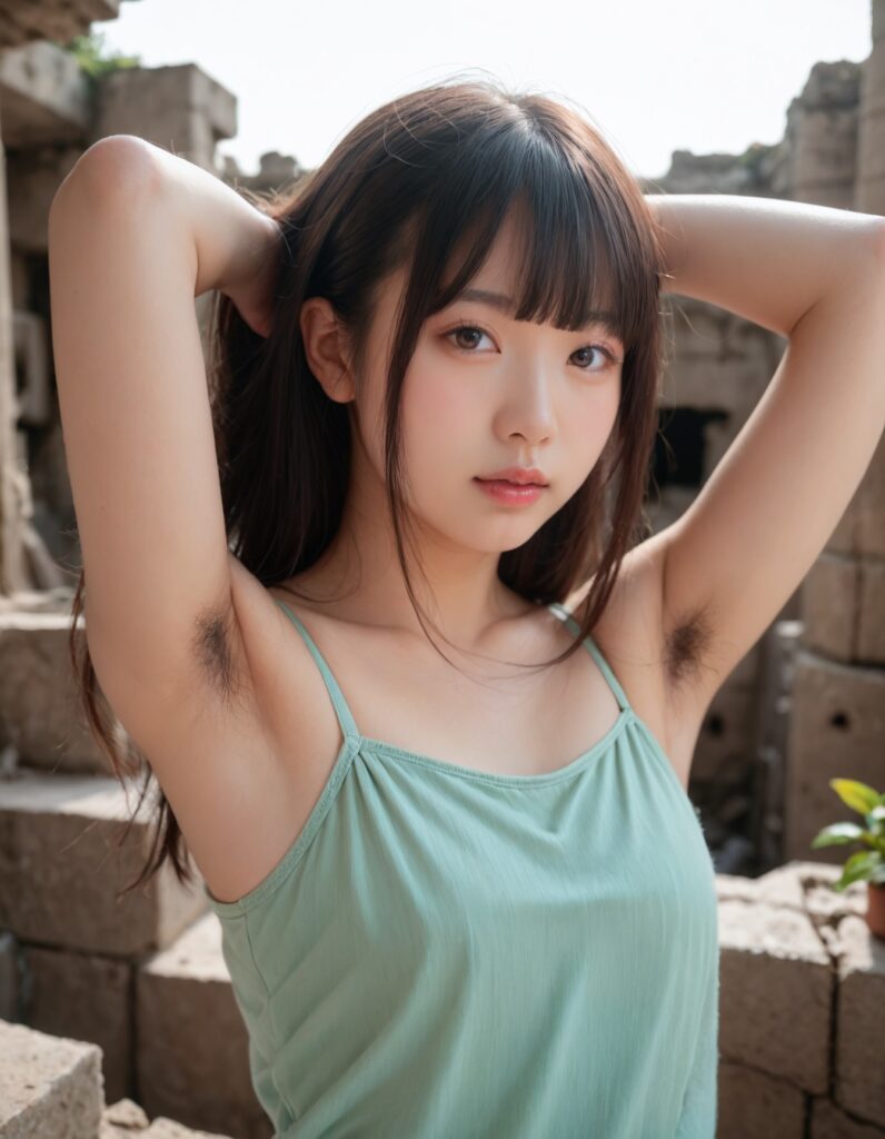 score_9, score_8_up, score_7_up, photorealistic, high resolution, very detailed skin, highly detailed face, japanese woman like kpop idol showing hairy armpit, (armpit hair), blunt bangs, mint green camisole, ruins, hotspring, upper body